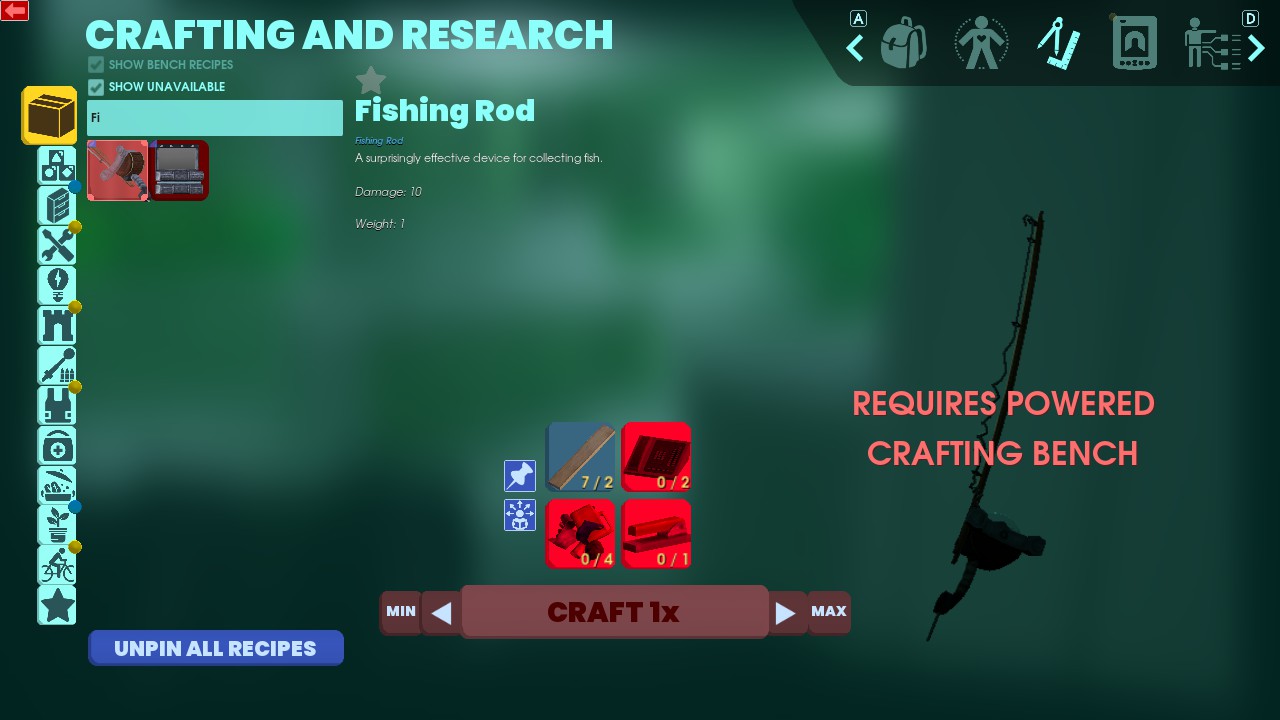 如您所见,绝缘棒需要一些高级物品才能制作。您可以轻松地在办公区找到钓鱼竿所需的物品。
