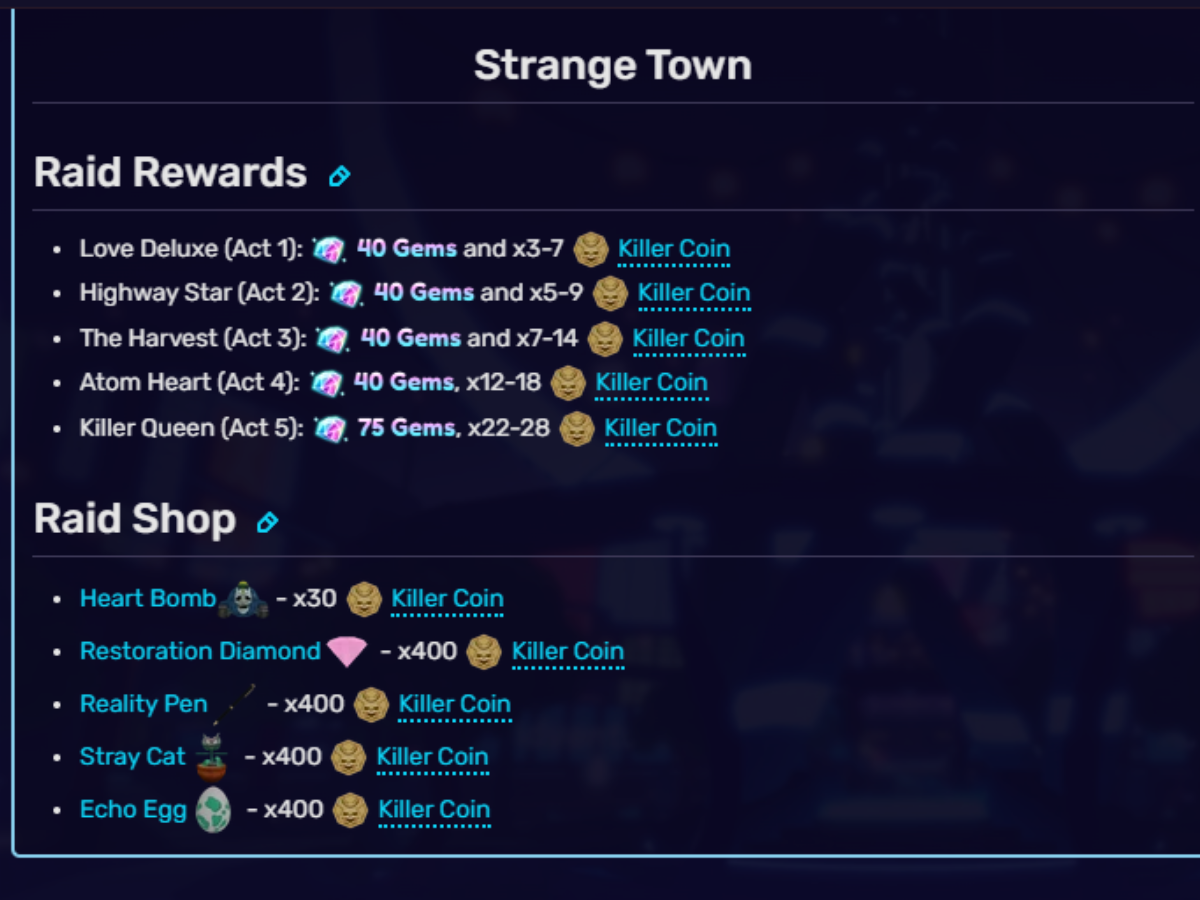 这次突袭中的每一个行为都提供40-75宝石和3-28个杀手硬币。但是,这是一种强烈的磨损,建议高级或退伍军人。可以将杀手硬币换成RAID商店中的物品。
