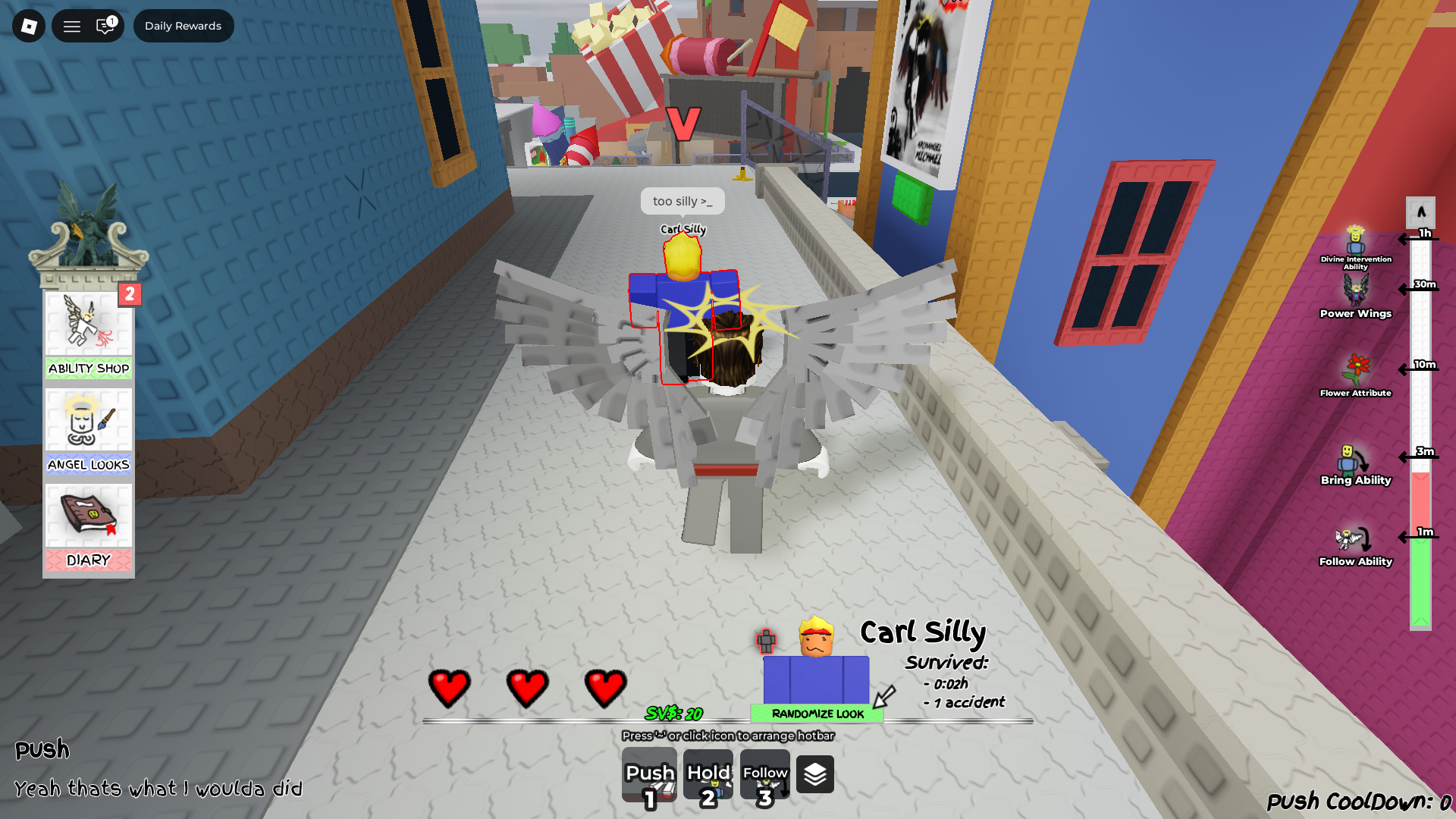 守护天使是 Roblox 中的一款搞笑游戏,您是随机 NPC 的保护者。游戏的名字非常贴切。你拥有能力,可以利用这些能力影响世界,以确保你的角色安全。游戏中有一些类似磨练的元素,但它们并没有压倒性的。你以三个生命开始新的一天。每次你的角色受到伤害,你就会失去一条生命。而且,生命的恢复需要三十秒的时间。