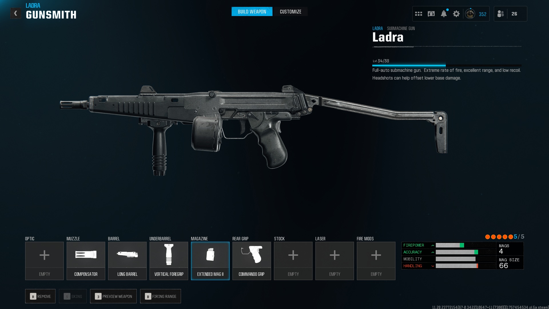 接下来,我们有扩展弹匣 II。 Ladra 拥有射速 1071 RPM,正因为如此,你会经常耗尽子弹。因此,强烈建议装备 Extended Mag II,将每个弹匣的子弹数量从 38 颗增加到 66 颗。这可以确保您有足够的子弹来同时攻击多个目标。