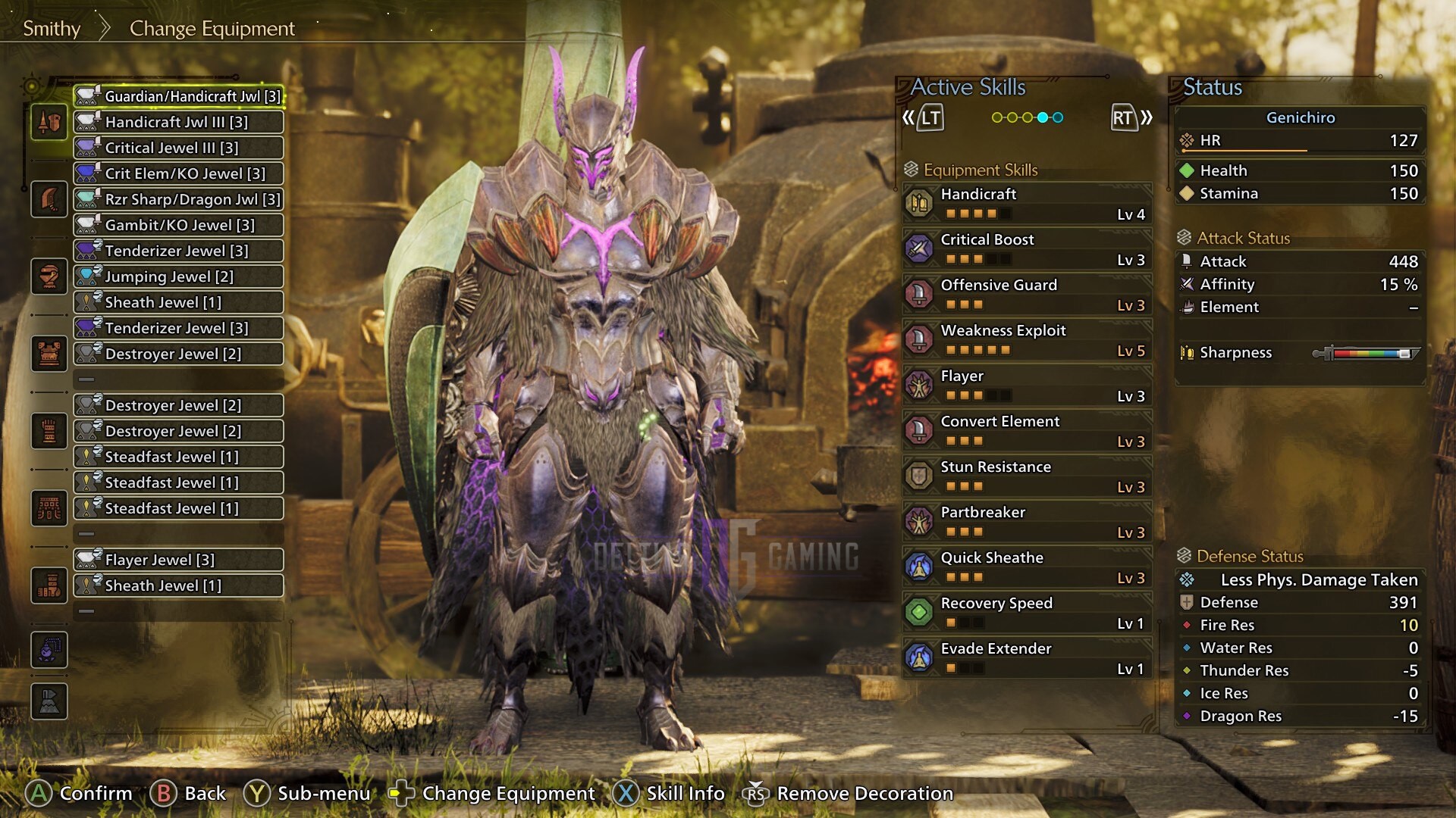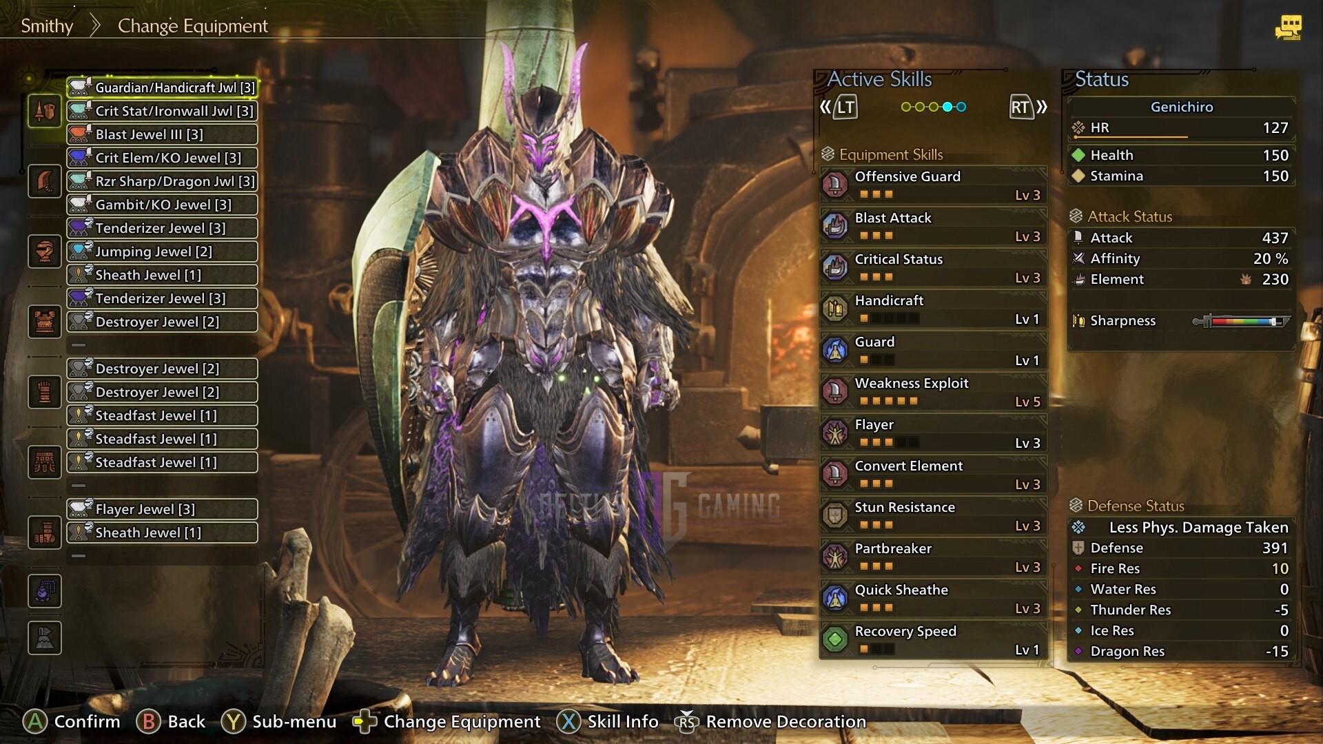 。我们不仅增加了爆炸伤害,而且还使暴击造成额外的元素伤害。这反过来又会影响怪物的整体状态。还可以添加几个暴击率宝石可以进一步增强武器的性能长矛擅长元素伤害,为了增强武器的强度,我们使用。然而,对于像长枪这样快速攻击的武器来说,20% 已经足够了。宝石,旁边改进的守卫