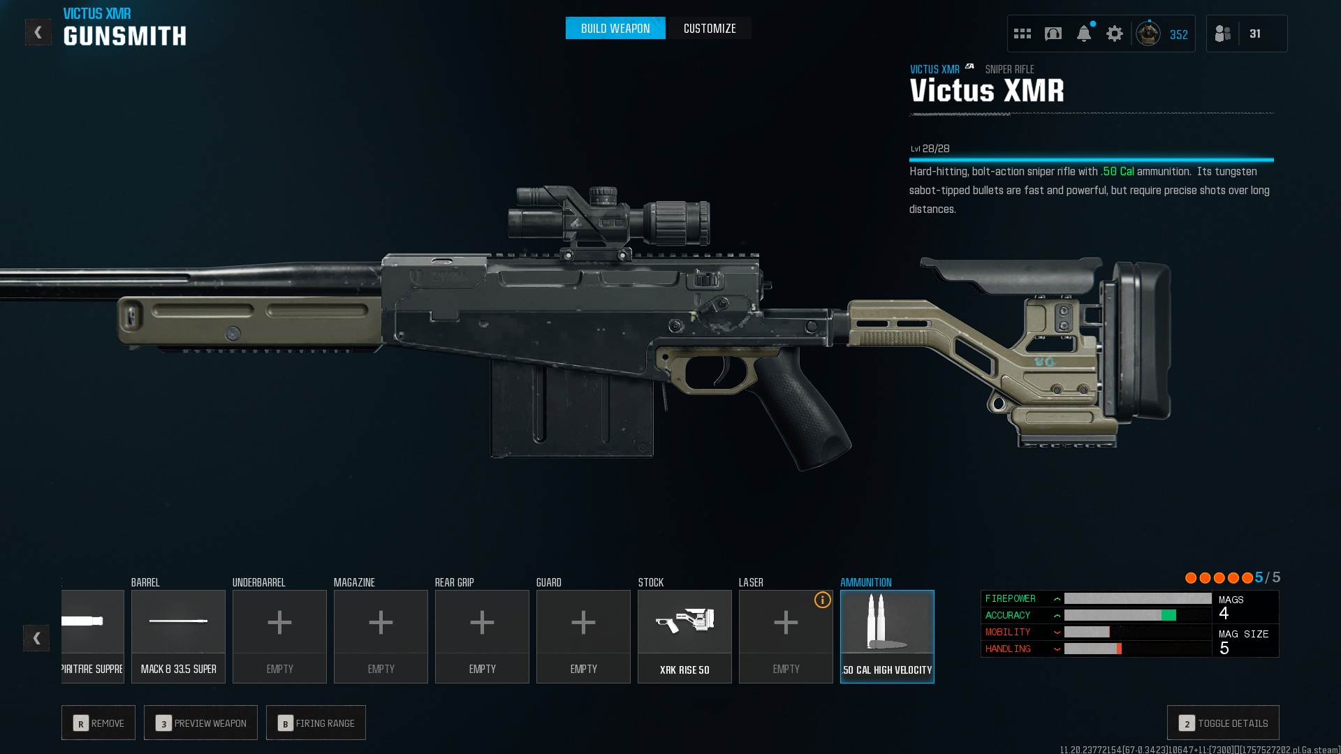 最后,我们有.50 Cal 高速回合。这些子弹增加了武器的子弹速度。凭借它和所有上述增强功能,Victus XMR 的子弹速度达到了 995 m/s。这使您可以轻松击中远距离的移动目标,甚至无需引导任何射击。