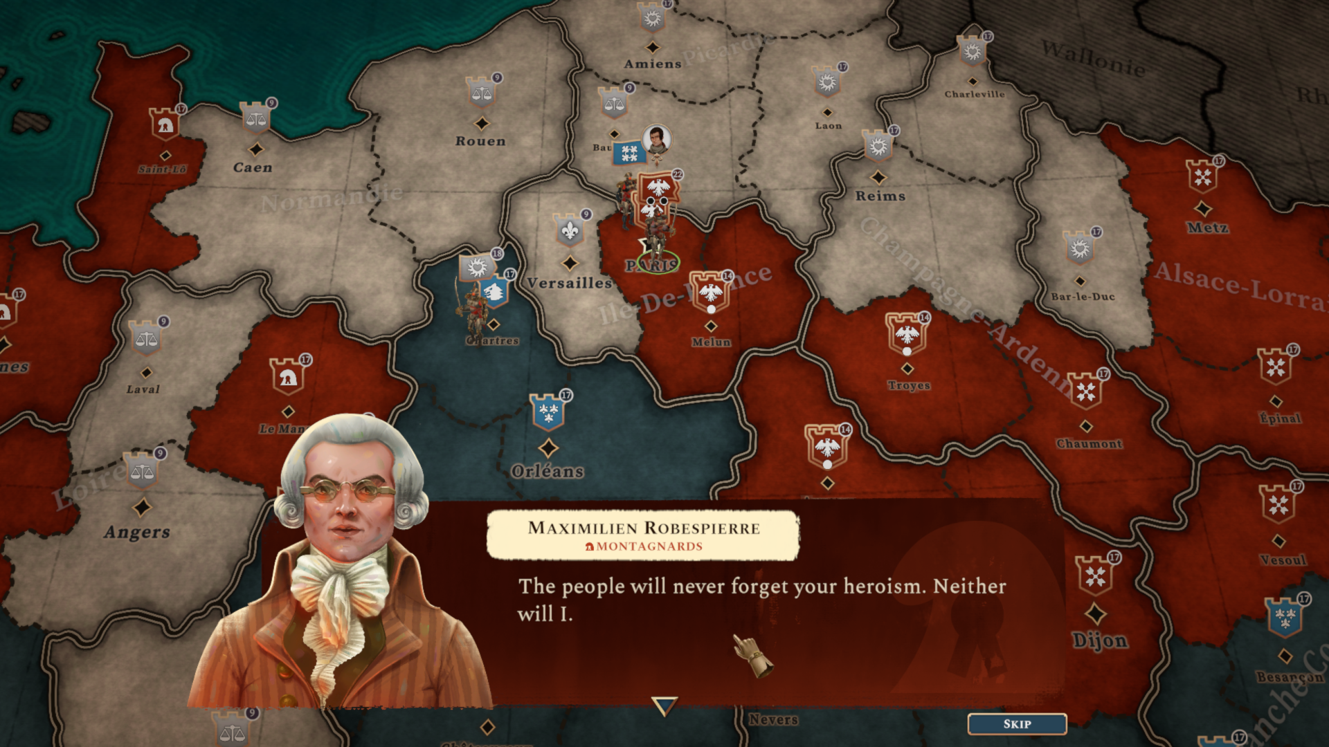 《波拿巴:机械化革命》最引人注目的地方在于它对法国大革命实际的一些思想流派的介绍。有趣的是,游戏利用真实的历史人物及其哲学来区分三个派系。然而,这只是我们理解的深度而已。是的,波拿巴使用恐怖作为游戏机制,这确实非常出色。可悲的是,它似乎并没有真正影响宏伟计划中的任何内容。