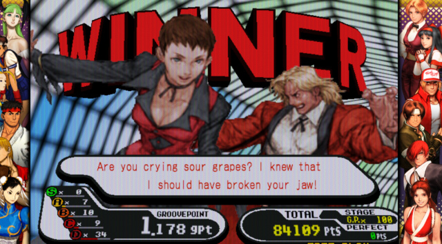 CvS 仍然有一些魅力,一些在《CvS 2》和《Marvel vs Capcom 2》等格斗游戏中更常见的爵士乐和喜怒无常的曲目也出现在这里。游戏的原创音乐是激烈而电子化的,但 CvS 中新的怀旧音乐选项也是一个选择。虽然我很高兴能够回到萨加特的《街头霸王2》主题,或者给鹅打酱油,但音乐被“最后一轮”音乐所覆盖,这似乎是一个疏忽,因为它失去了改变音乐的意义。虽然名单很小并且以《街头霸王》和《拳皇》为中心,但名单中的大多数角色都有两个版本——普通版和额外版。 Capcom 角色的普通版本通常代表《街头霸王 Alpha》系列中的“现代”版本(当时),而 Extra 版本则有点回归“经典”《街头霸王 II》版本。在 SNK 方面,Normal 和 Extra 所代表的内容有点不同,这是可以理解的,因为这些角色出现在多个系列中:《饿狼传说》、《拳皇》(KOF) 和《格斗艺术》。普通尤里代表了她的 KOF 化身,而额外尤里则类似于她在《格斗艺术》中的外观。与此同时,Kim 的普通版本类似于《饿狼传说》中的玩法,而 Extra Kim 则类似于他的 KOF 版本。如果你想花时间玩的话,这里有很多游戏,而且由于它是一个合集,所以即使你最终选择了更受认可的 CvS 2,尝试一下也没有什么坏处。
