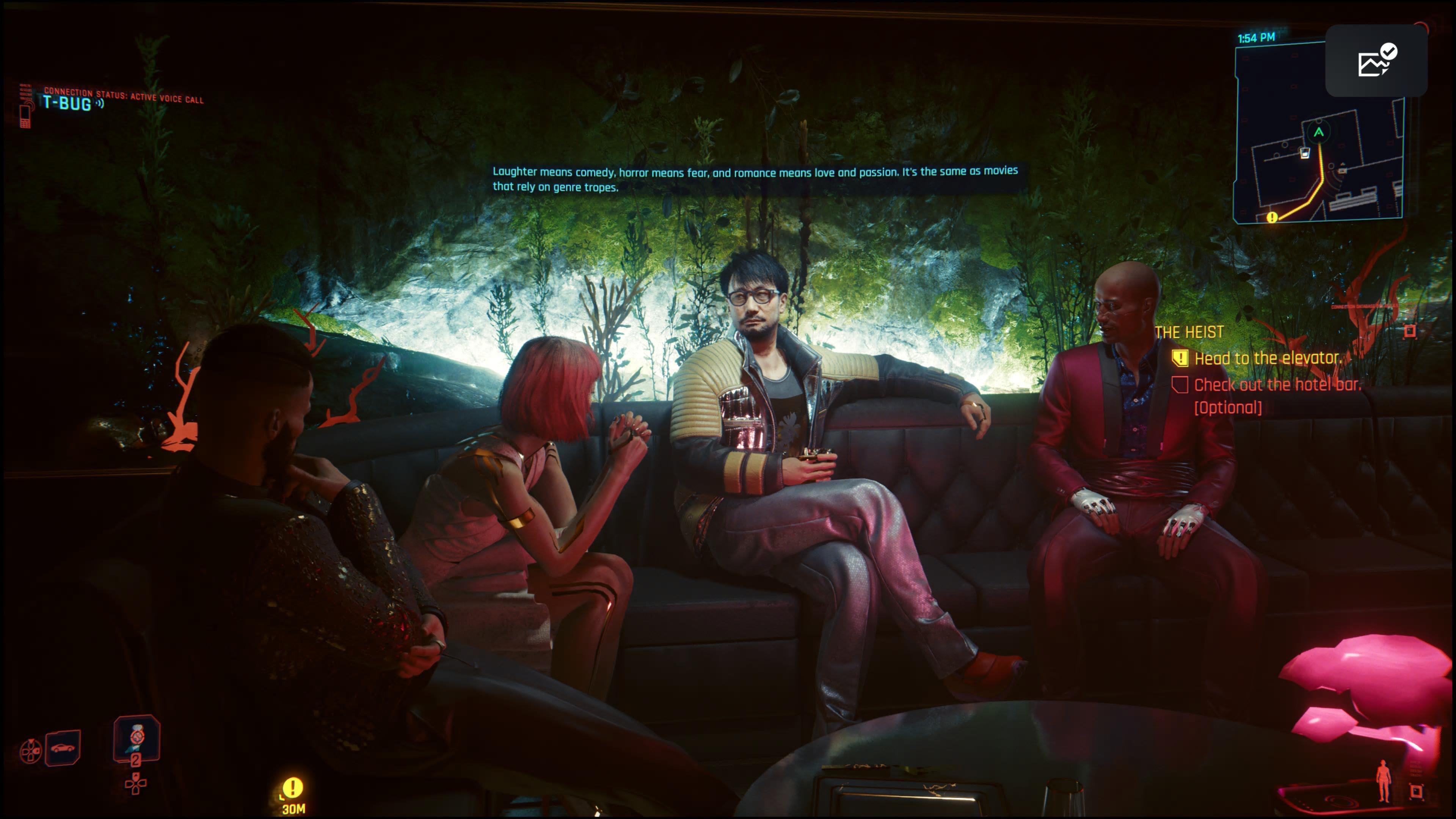 在“抢劫”任务中,玩家可以在 Konpeki Plaza 酒吧发现小岛秀夫作为客人。他就在那里,坐在沙发上,谈论娱乐中的故事讲述。