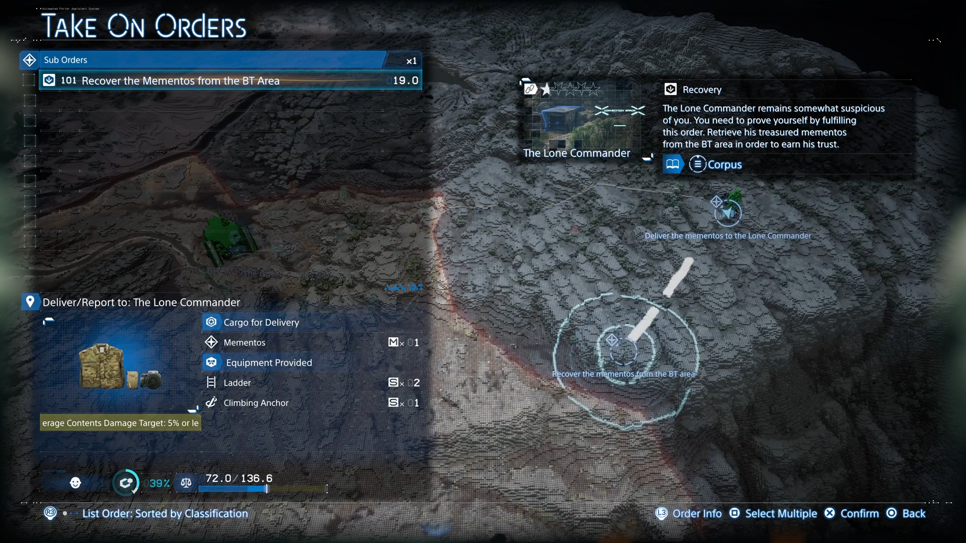要获得此订单,您需要接受子订单将拆解的步枪交给孤独的指挥官[易碎货物]从政府基地。这不是一个主要订单。你不需要完成它来继续主要故事。一旦你将货物交付给孤独指挥官,他会告诉你,只有你完成他的最新订单,他才会成为手性网络的一部分。任务简介从 BT 区域取回纪念品是: