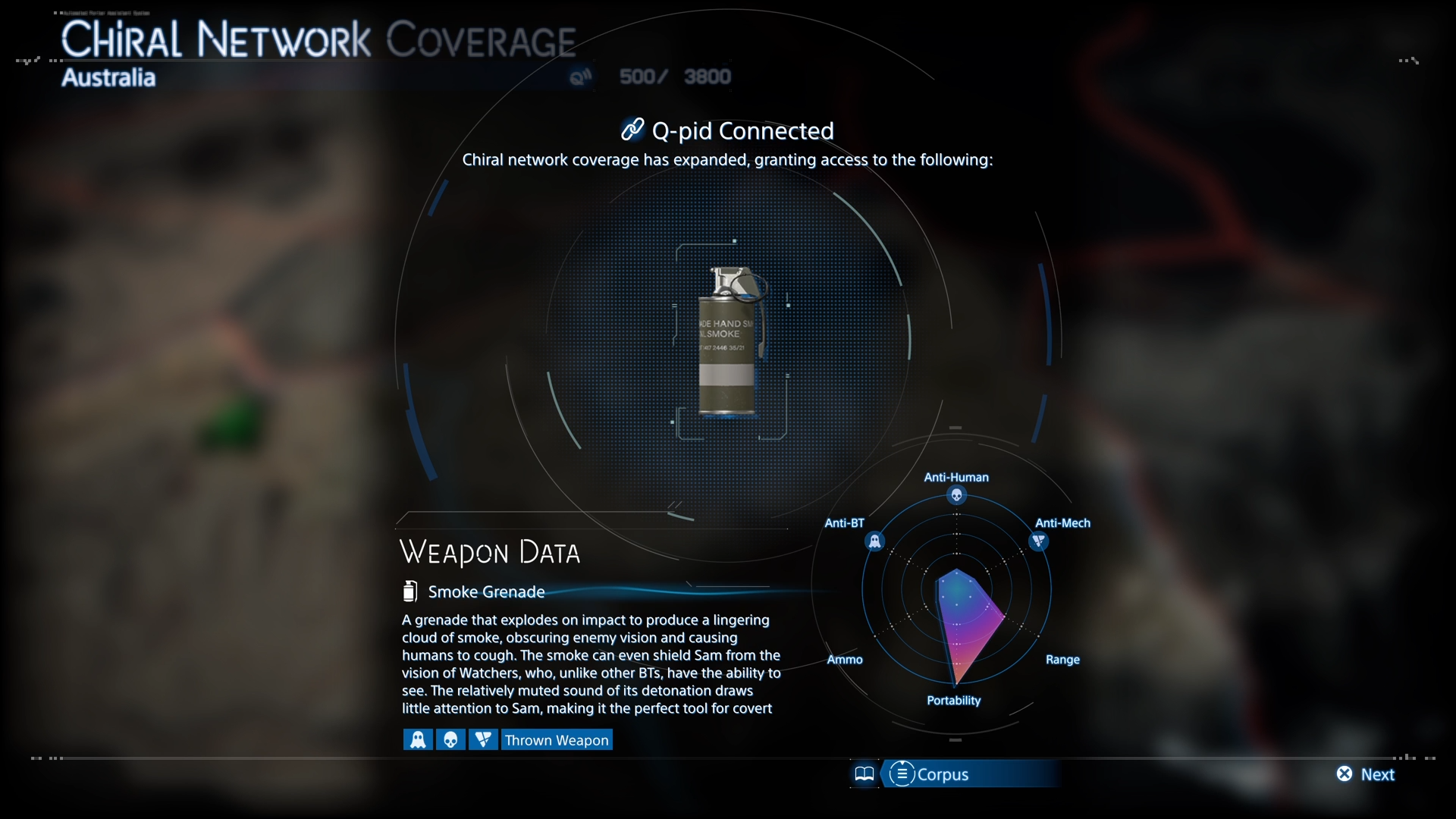 “手榴弹在撞击时爆炸,产生持久的烟雾,模糊敌人的视线并导致人类咳嗽。烟雾甚至可以保护山姆免受观察者的视野,与其他BT不同,观察者有能力看到。其爆炸的相对静音的声音很少引起山姆的注意,使其成为秘密行动的完美工具。可以存放在手榴弹袋中。”