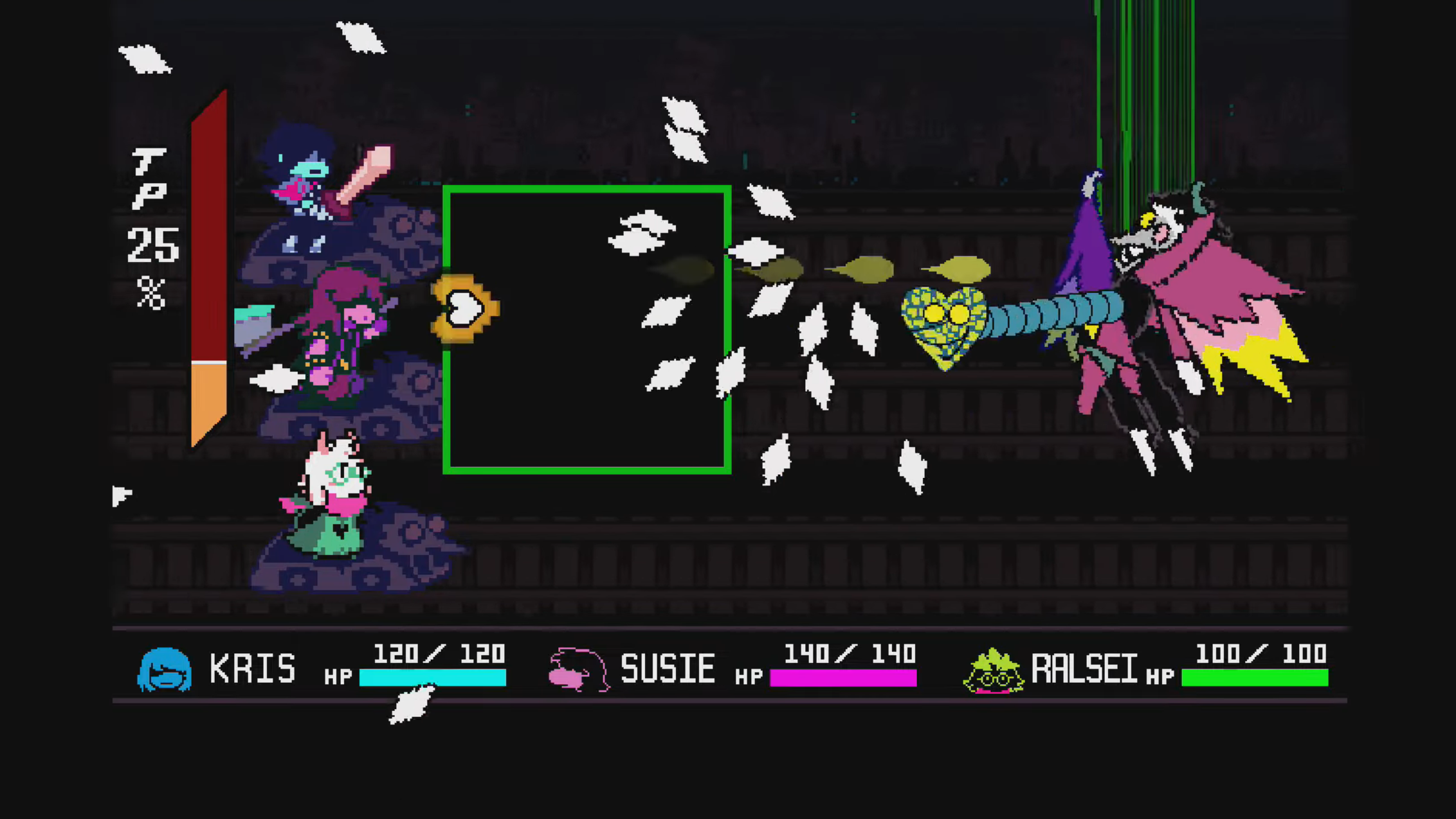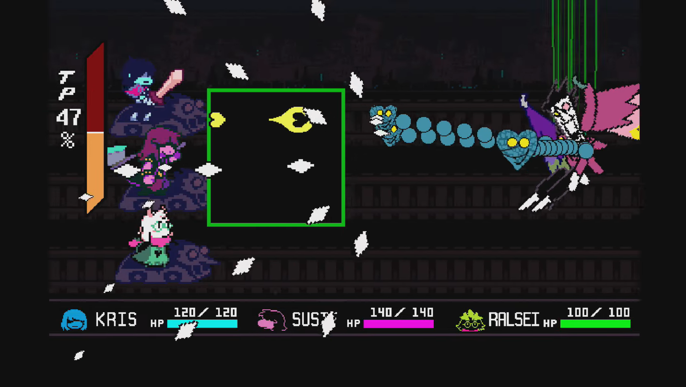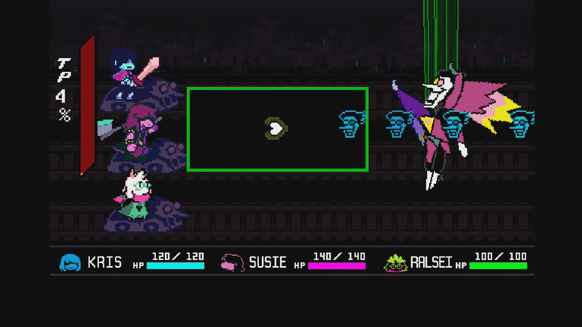 你必须躲避从后面射来的射弹,同时还要躲避他后来从嘴里射出的一些幽灵般的人物。一旦你击败了这个老板,你将可以最后一次选择“全部捕捉”选项。这最终会折断所有携带Spamton的藤蔓,从而导致Boss战的结束。