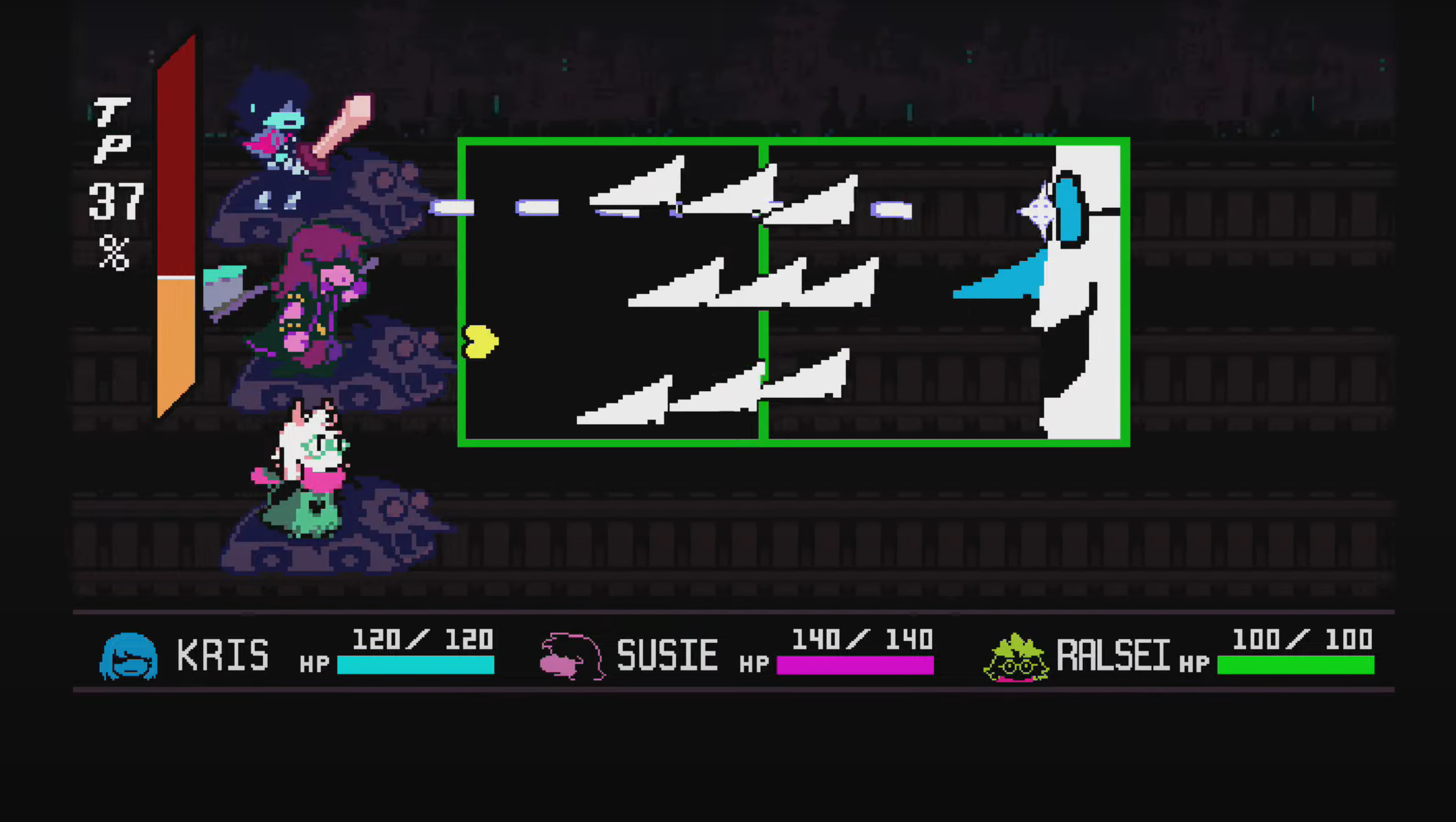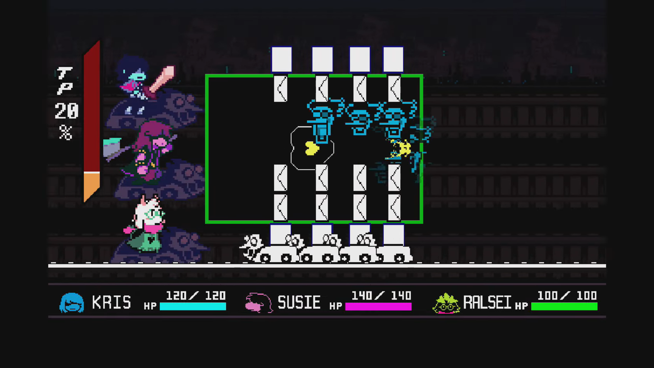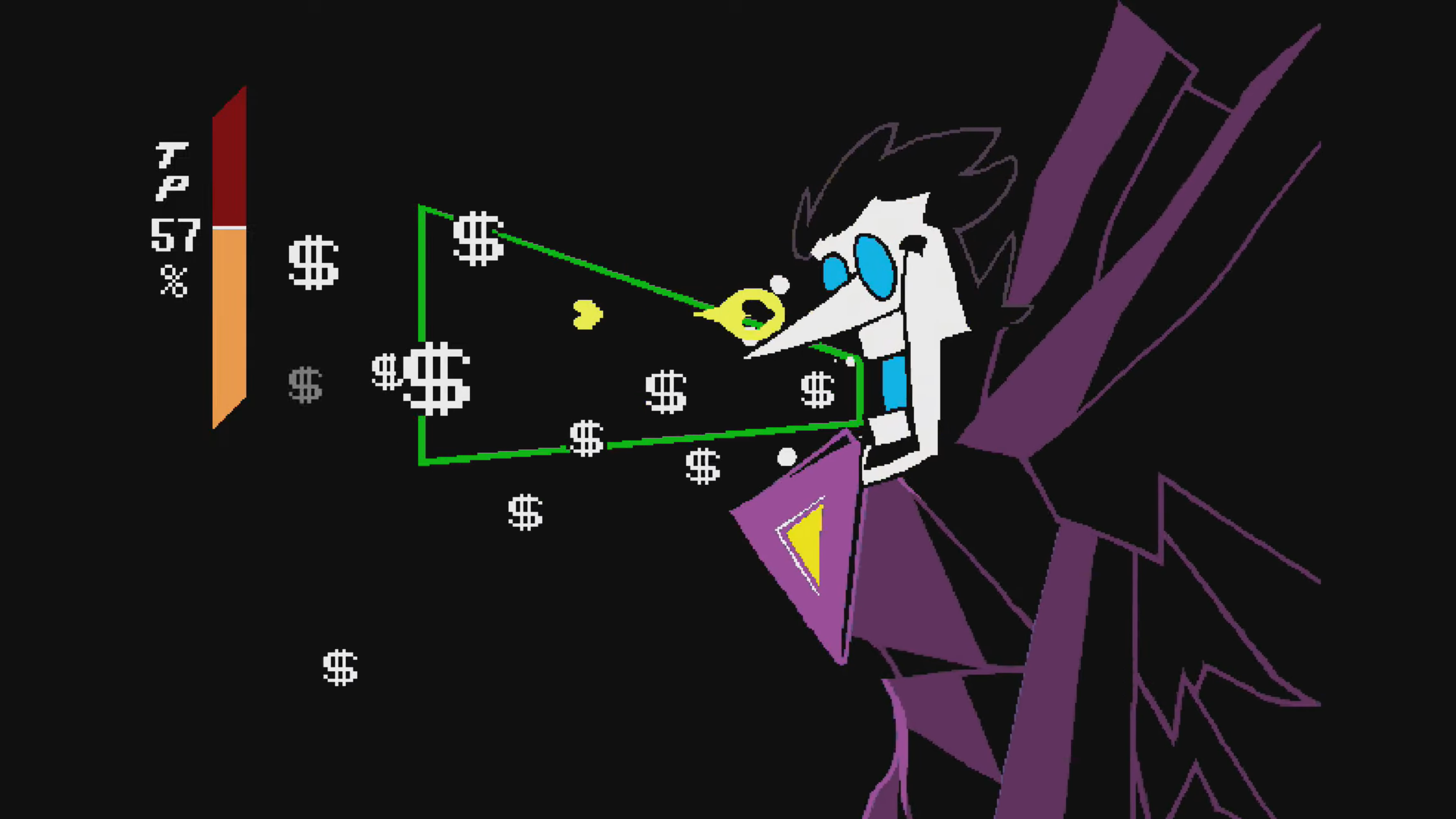 当你们沿着黑暗的隧道滚下时,你们三个人都被放在三个独立轨道上的三辆矿车上。沿着这条线的某个地方,Spamton 的蓝色头像漂浮在您的面前。您将收到一颗黄色的心,您可以将其传递给您的朋友,以射击他们的头部。