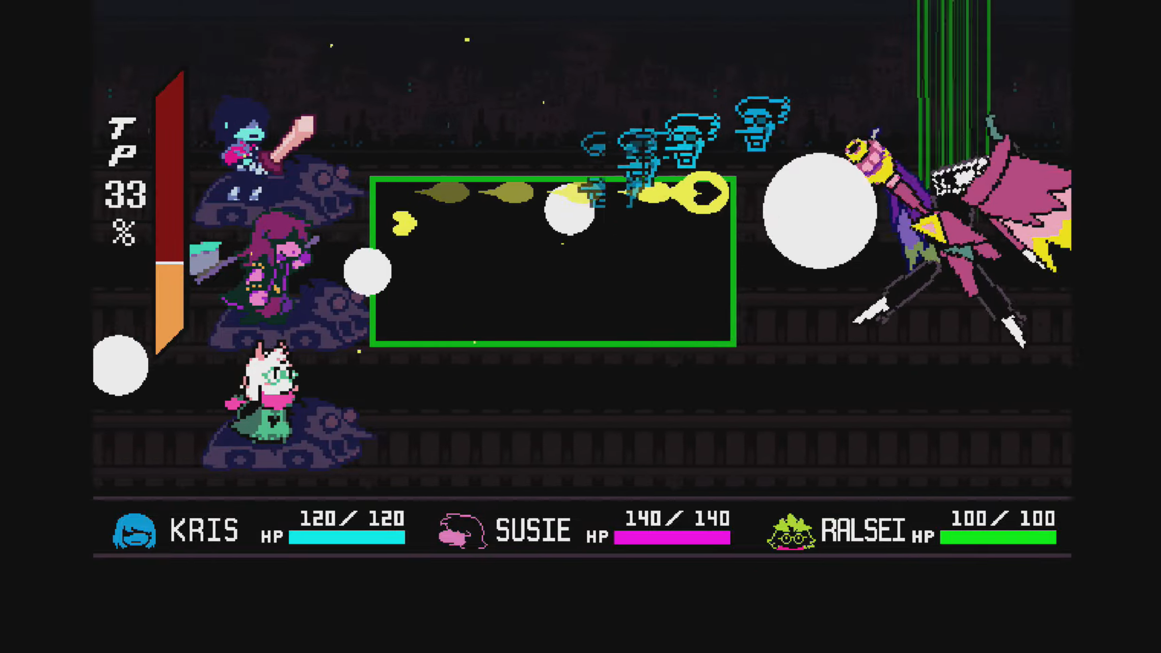 这是一个快速回合,不需要任何射击。您只需在绿色框中找到的任何自由空间中移动心脏即可躲避传入的射弹。斯帕姆顿的巨大面孔将从他的眼睛中同时射出激光,并从他的嘴中同时射出碎片。只要躲避障碍物,你很快就能完成这一轮。最后,选择“全部捕捉”。