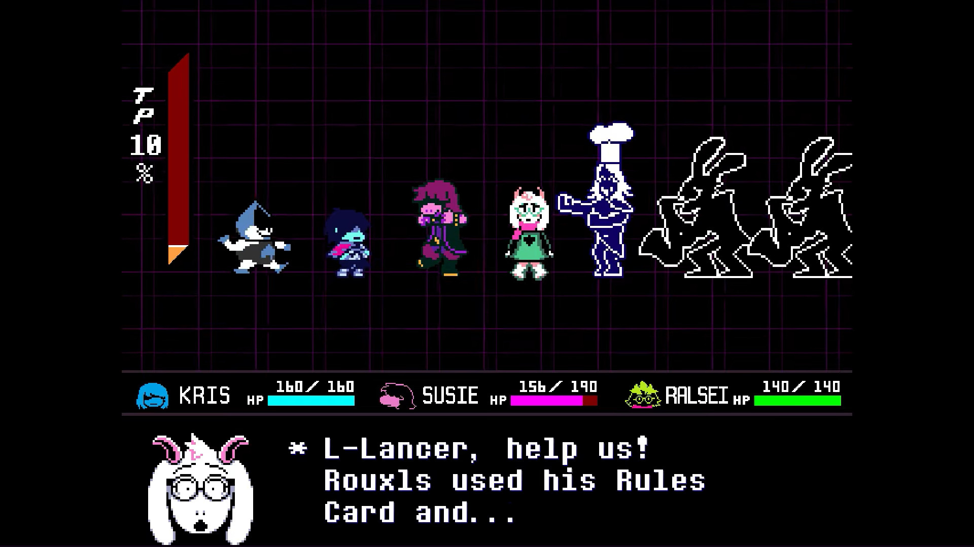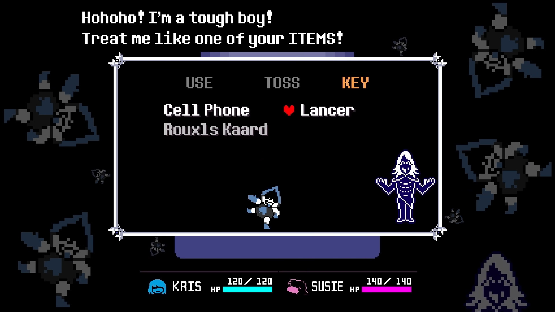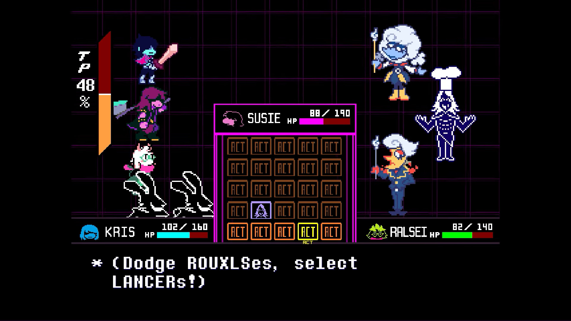 两个新的敌人会出现,并将毛线球抛向空中,毛线球会弯曲落到你身上。此举之后,Lancer将带出拉尼诺和埃尔尼娜。此外,这里的难度急剧上升,因为你现在有 5×5 的 ACT 按钮网格可供选择。此外,Rouxls开始干扰ACT板,所以你可能会不小心选择Rouxls而不是Lancer。尽量避免选择 Rouxls。