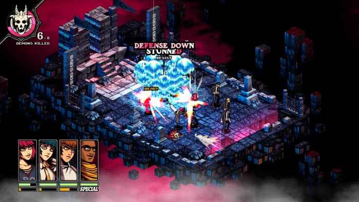 人们想要玩《Demonschool》的另一个重要原因是它的回合制战术 JRPG 战斗系统。玩家获得一系列行动点。他们可以选择他们想要执行操作的任何角色。每个角色的第一个动作花费一个AP,第二个动作花费两个,依此类推。因此,玩家使用的角色越多,他们的行动消耗的 AP 就越少。规划阶段包括玩家选择如何使用他们的 AP、查看结果并决定是否要撤消某些操作。完成后按住三角形,动作阶段将执行所有玩家命令。