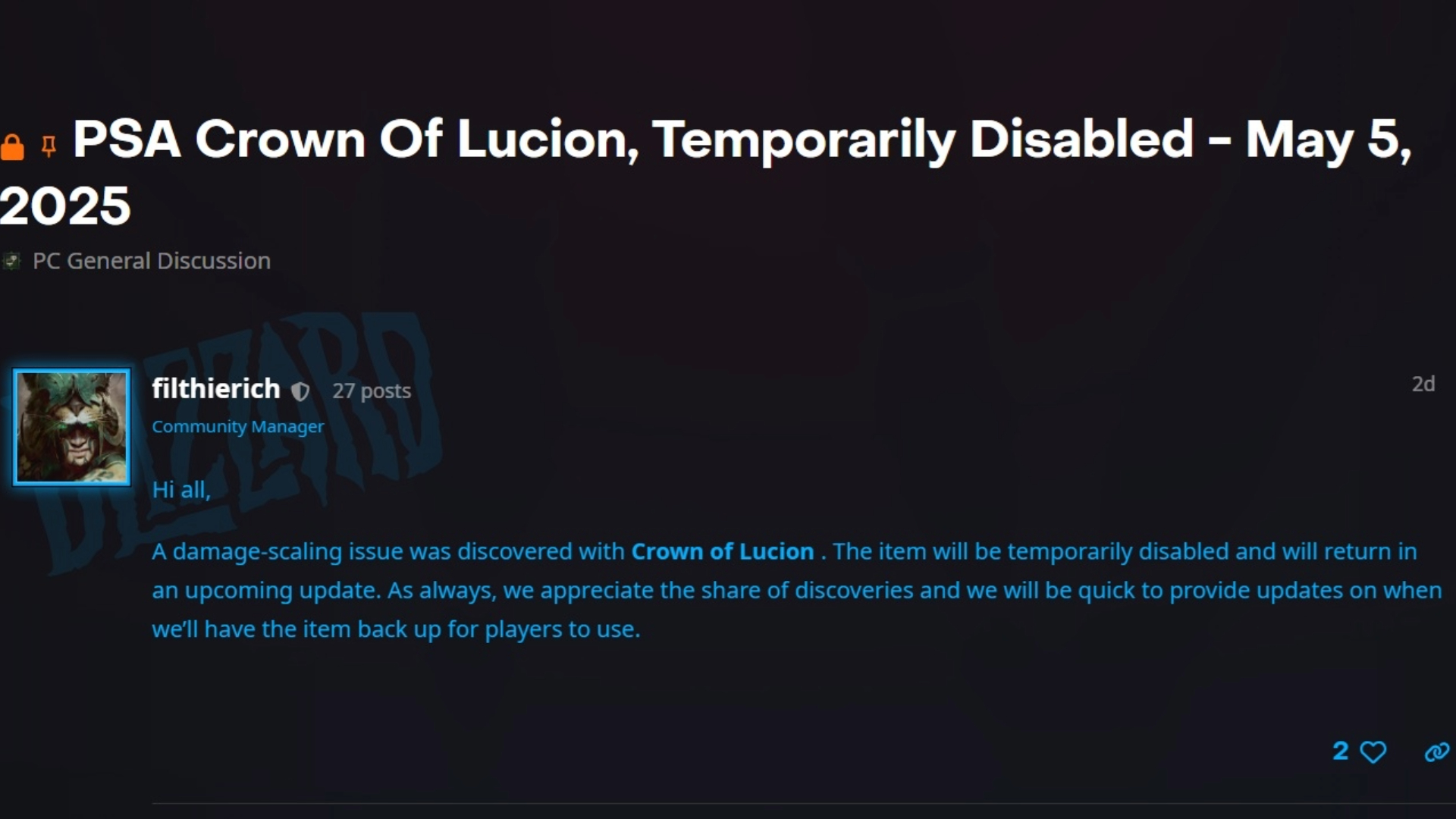 阻止列表中的物品是当前游戏中存在但无法装备的任何装备。当暴雪注意到任何物品存在平衡问题并阻止玩家在玩游戏时使用它来获得不正当优势时,通常会发生这种情况。例如,2025 年 5 月 2 日,许多玩家声称卢西恩王冠显示了封锁列表中的物品消息。这是因为该物品的伤害缩放问题。暴雪目前正在研究该装备,一旦伤害缩放问题得到解决,您应该很快就能装备它。问题曝光后不久,该公司的一位社区经理通过帖子证实了这一点。