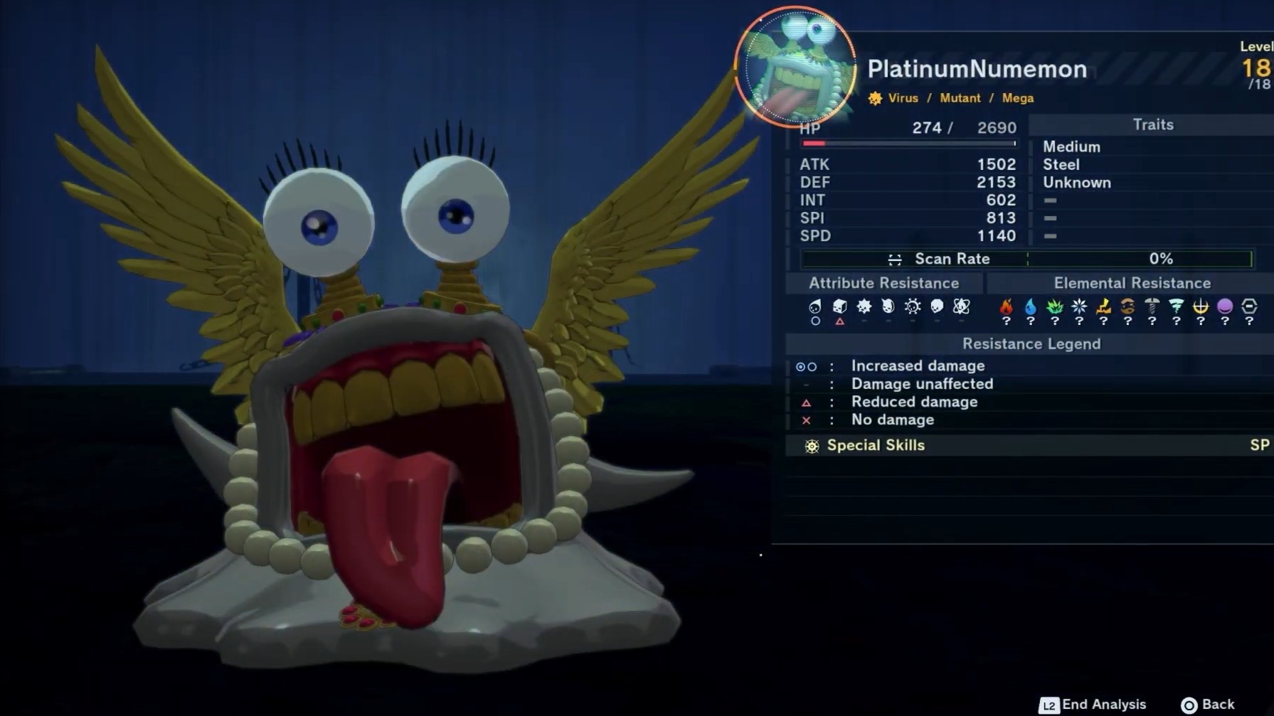 进入地点后,前往左边直到你到达死胡同,你会发现白金数字兽在等着你。当白金数码兽 Boss 战开始时,你会发现数码兽处于终极级别,但与杰兽有着大部分的优点和缺点。以下是击败 PlatinumNumemon 的一些技巧: