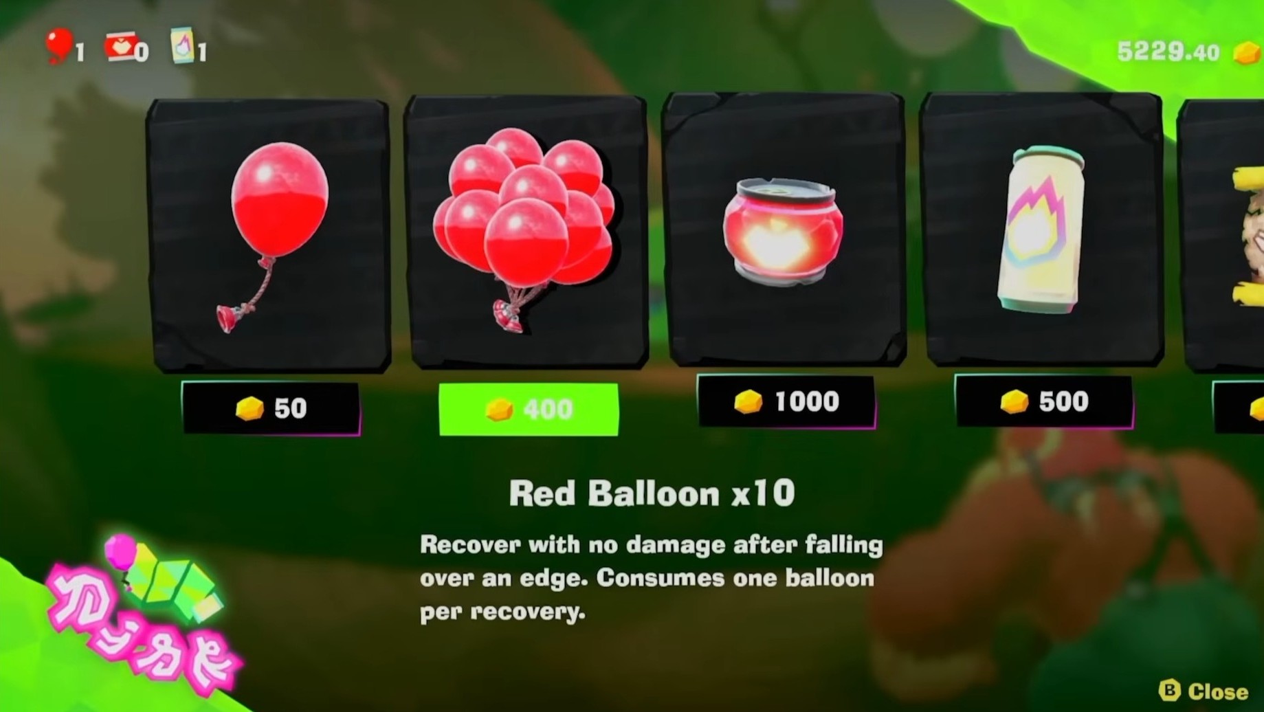 苹果汁允许DK(大金刚)在失去所有心的情况下立即复活,而不是从最后一个检查点开始。消费哈密瓜汁即使 Bananergy 计量表未满,您也可以使用 Bananza Powers。红气球如果DK掉进坑里,他们就是救星,每次他掉进去都会消耗一个气球来把他救出来。