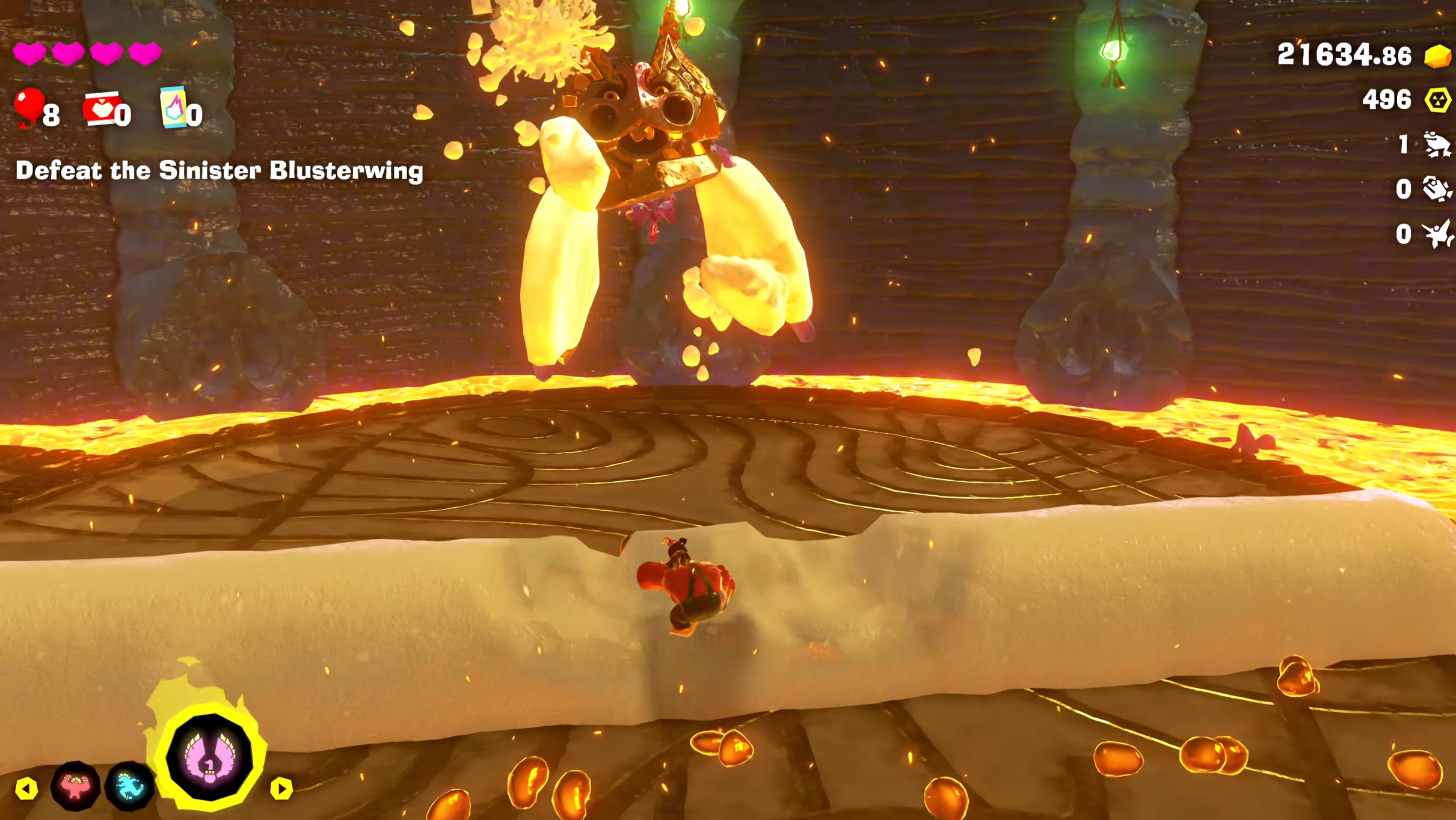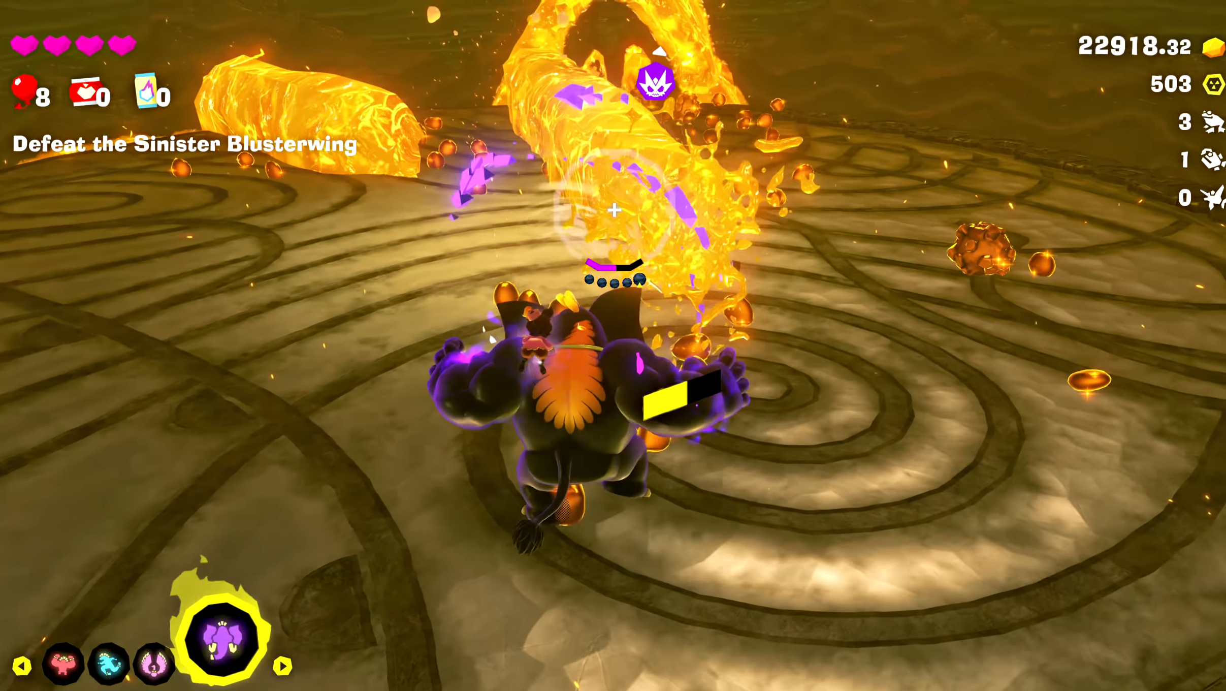 为了打败这一轮,你将变身为大象巴南扎形态并再次使用吸气力量。围绕竞技场旋转,您会注意到漂浮的岩浆块。借助吸入的力量,将大块岩浆储存在你的躯干中,瞄准 Boss 的翅膀,然后射击。慢慢来并正确瞄准,因为老板会不断移动。