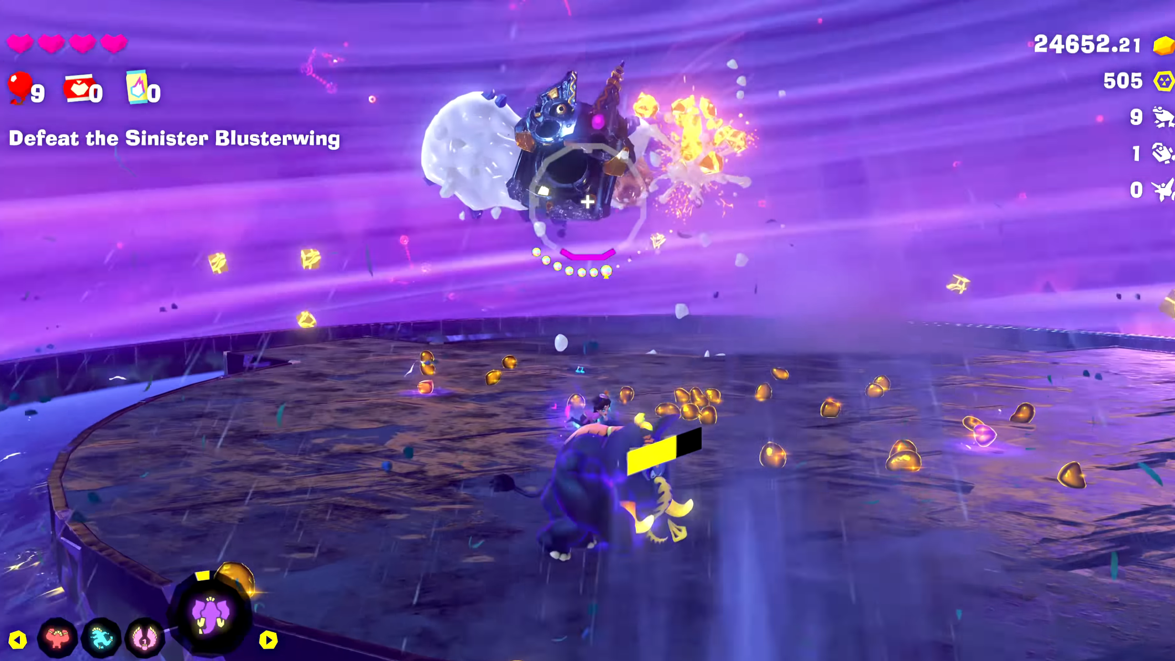 一旦你储存了足够的能量,松开按钮,瞄准 Boss 的翅膀,然后按“ZR”向其投掷射弹。在两侧翅膀上重复此操作,老板就会掉到地板上。现在利用这个机会对险恶狂风翼造成伤害,直到其生命值接近于零。
