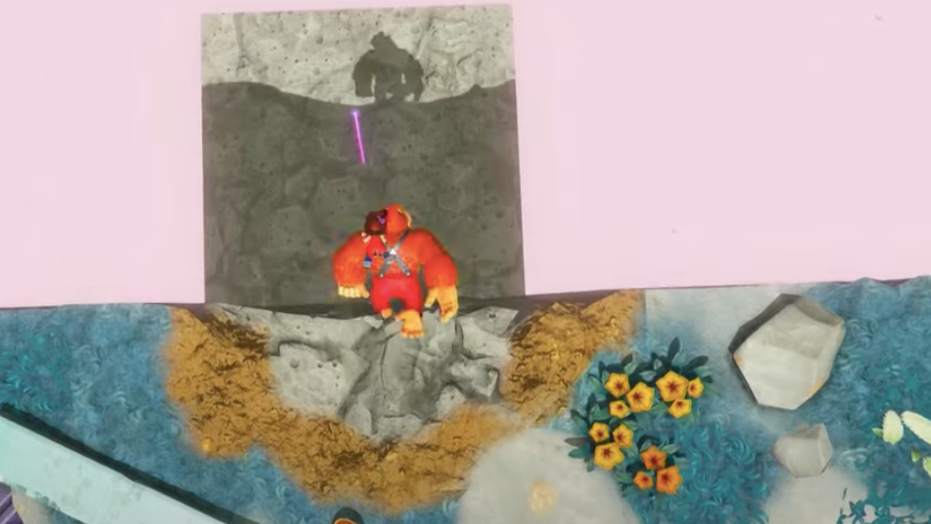 第二个 Banandium 是三个中最具挑战性的。收集第一颗宝石后,走几步直到到达岩石表面。从地上挖出一块岩石,然后前往平台的左边缘。往下看,你会看到一个立方体在上下移动。