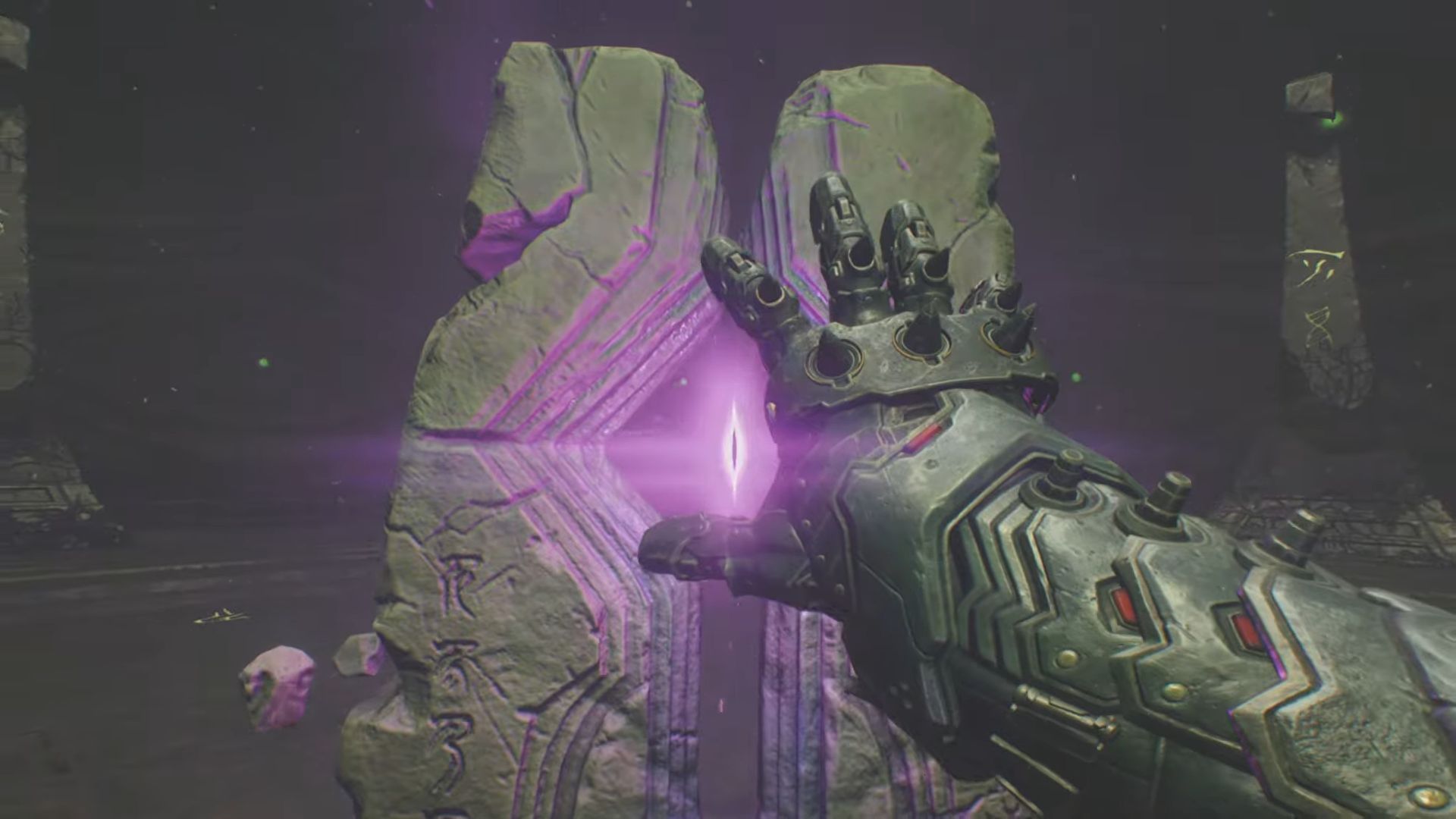 之后,您将在块的侧面看到一个绿色圆圈。这意味着您可以对其进行屏蔽充电。准确地做到这一点,方块就会滑向圆柱形结构,这样你就可以轻松地攀爬它。然后继续跟随任务标记,直到到达另一个发出紫光的石头结构。与它互动将带你直接到达下一个区域,恶魔会在那里伏击你。