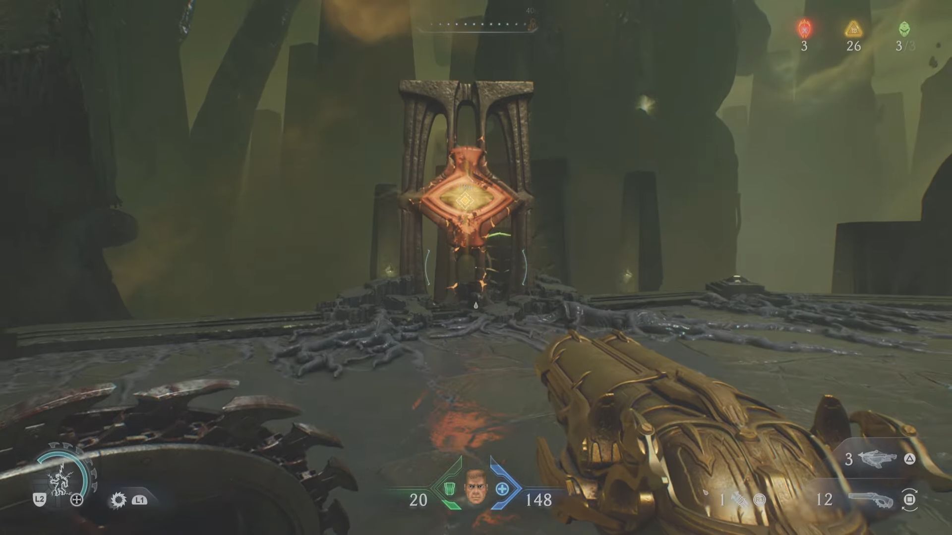 在这个区域你应该做的第一件事是从你站的地方右转,步行一段距离到达哨兵神社,升级你的武器或盾牌。之后,从传送门向右直走,找到悬挂在空中的绿色球体。这标志着《毁灭战士:黑暗时代》中平台跳跃部分的开始。盾牌冲锋穿过球体,它将带你前往第 15 章中的下一个可探索区域,龙城。