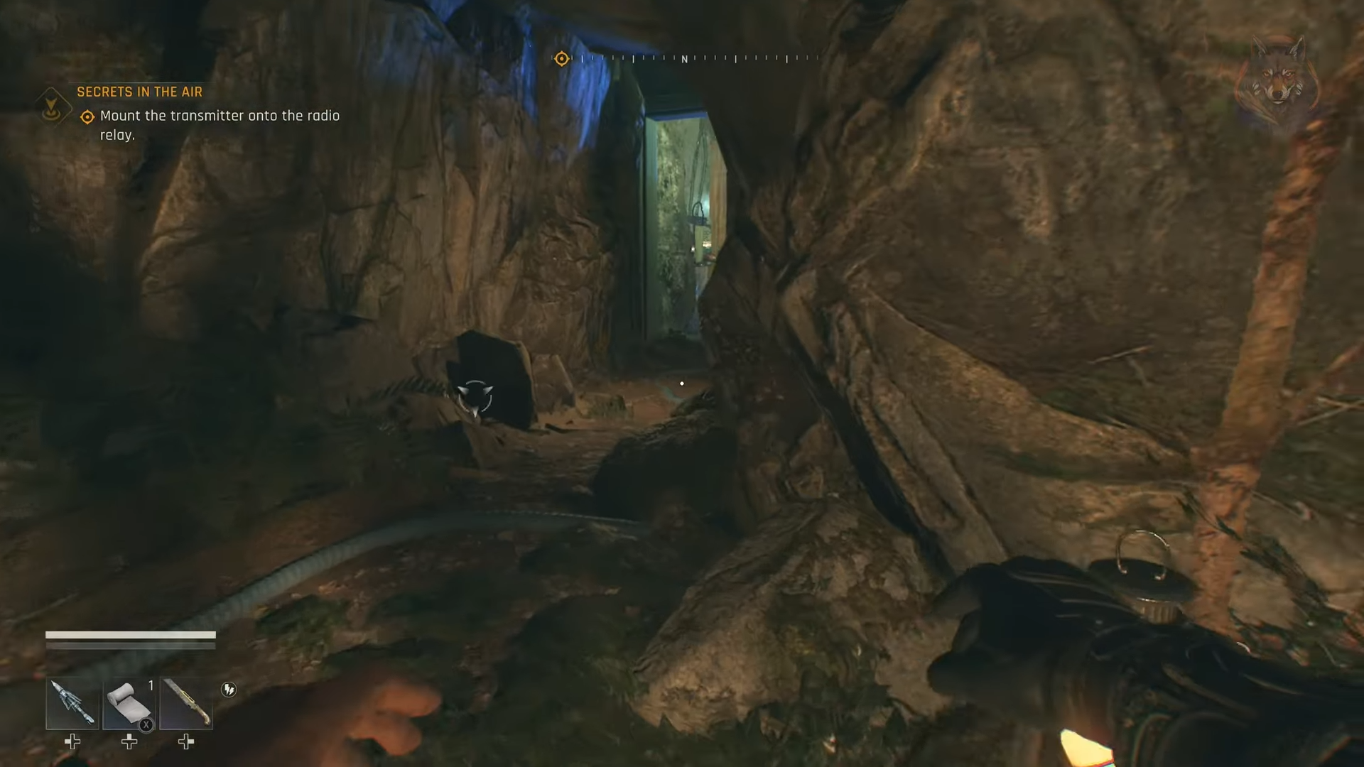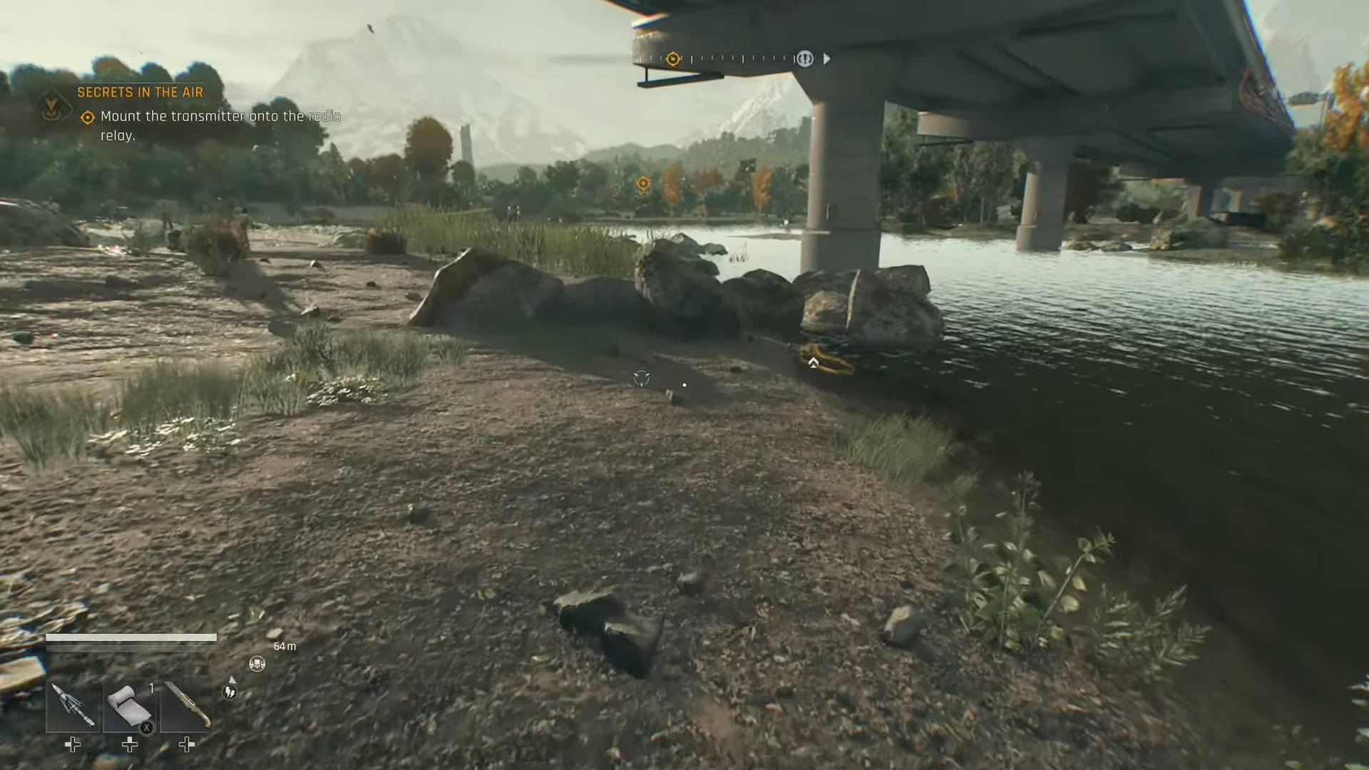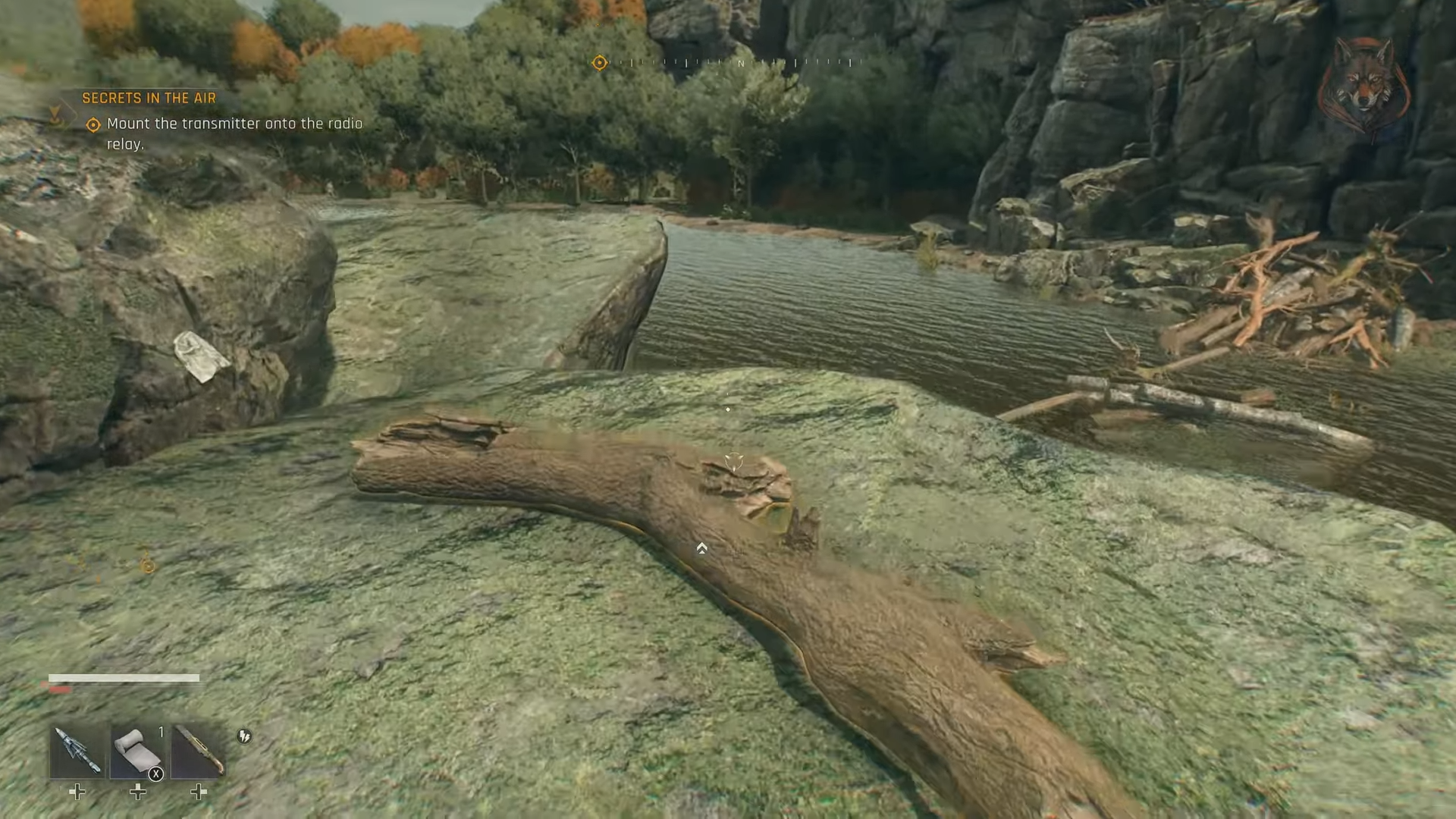 要安装所有摇杆,只需按住交互键即可。一旦原木正确放置,就穿过水面到达木棍结构的另一侧。在你的右边,有一个小平台可以爬上去。