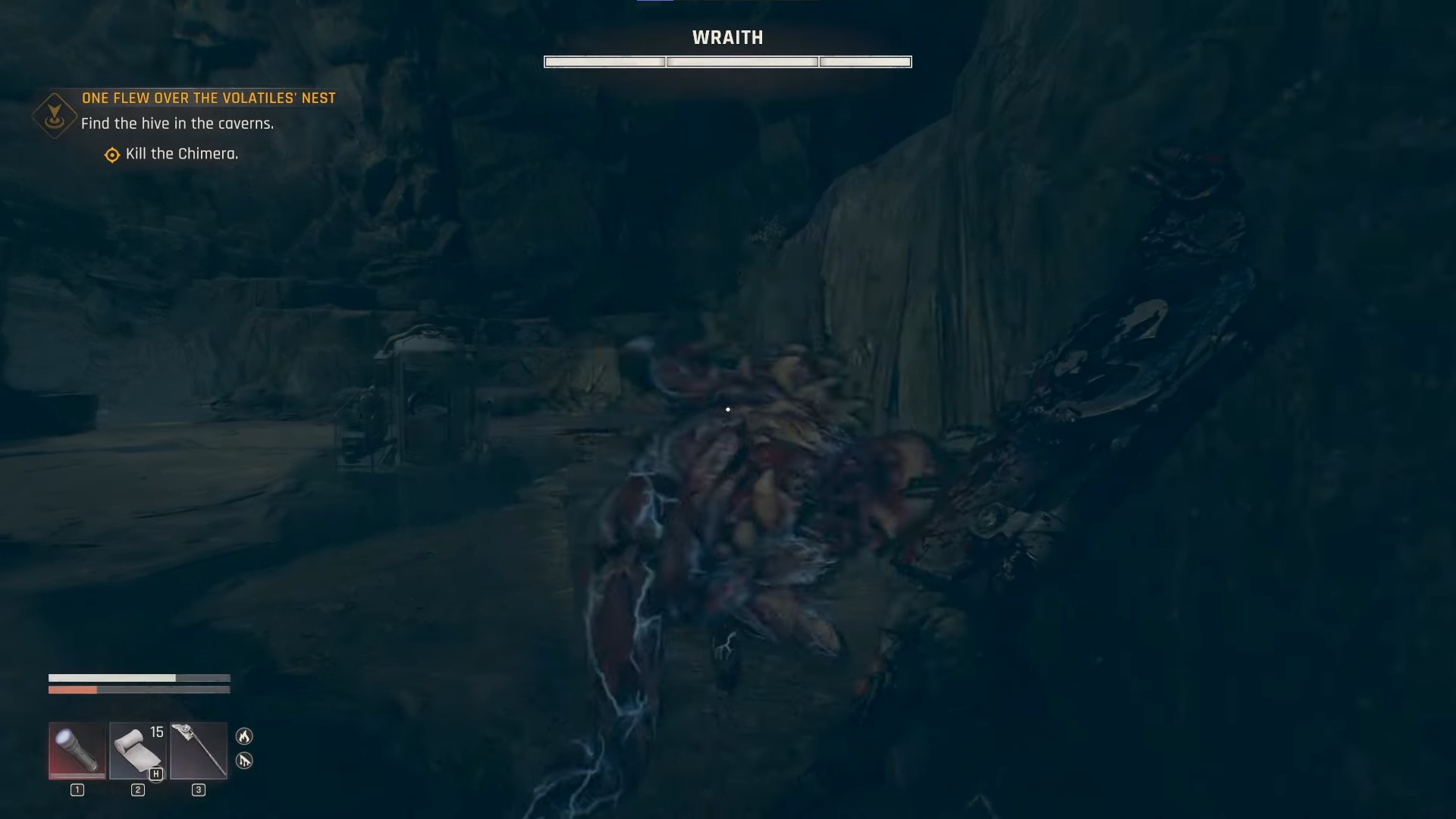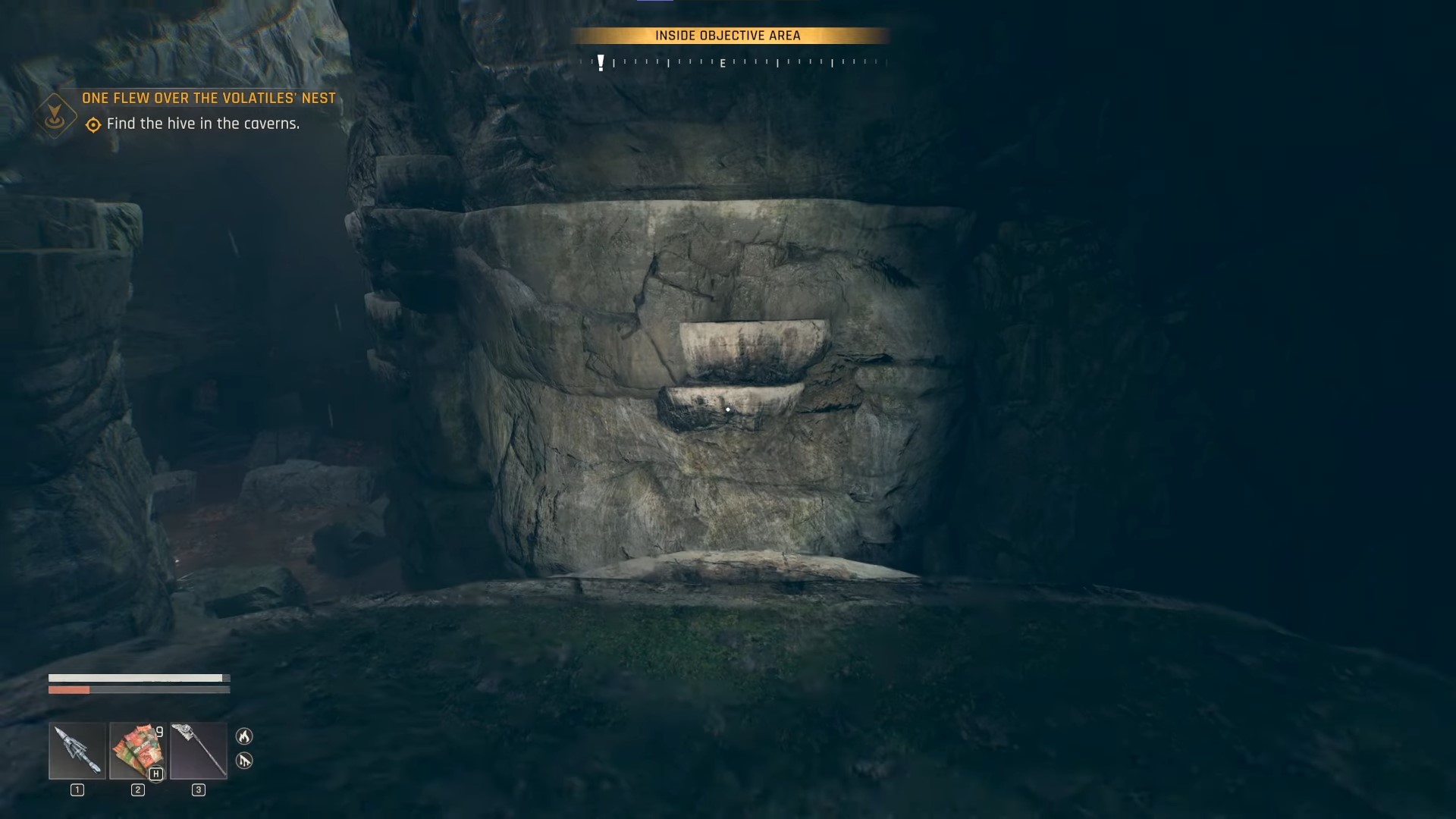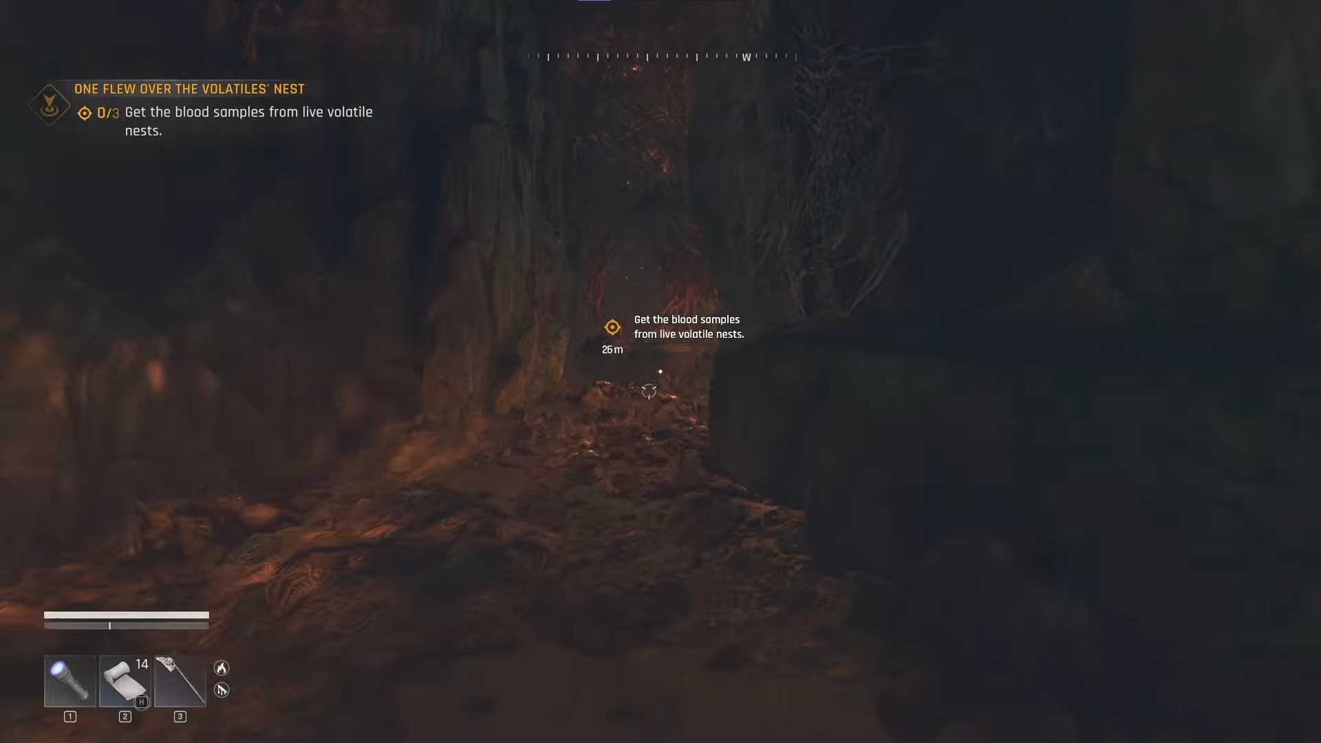打完boss后,你必须跟随标记才能深入巢穴。巢穴里充满了挥发物,只要你惊动其中一只,它们就会瞬间杀死你。为了让事情变得更容易,所有三个样本都被标记,这样你就可以在巢穴周围偷偷摸摸地抓住它们。获取第一个样本很容易,但至于第二个和第三个样本,你就必须小心了。有许多巨大的岩石可以帮助你躲避挥发物。安静地移动,抓住所有三个样本以进一步进行。