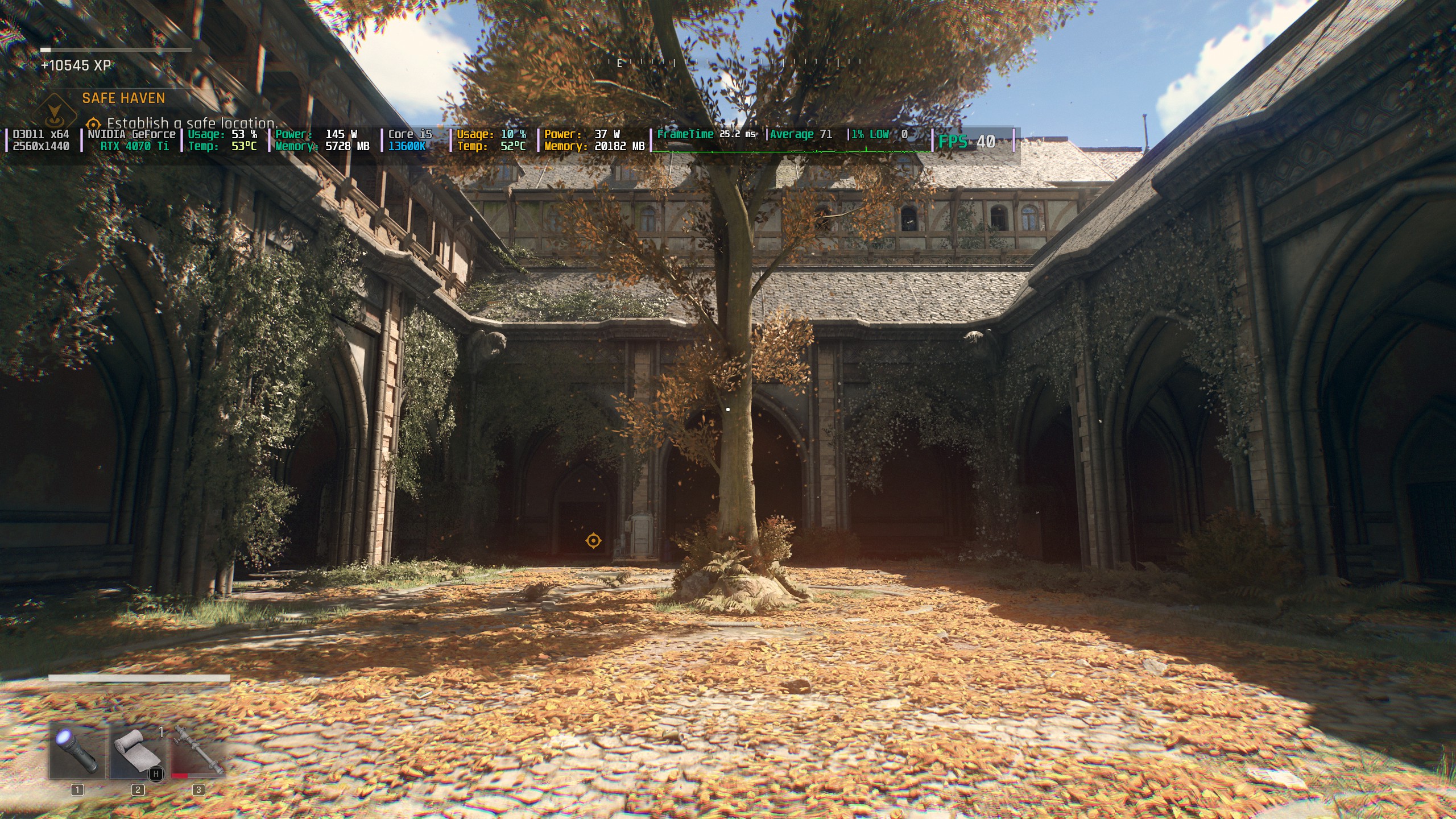 我们测试的系统由 Intel Core i5-13600K 和 RTX 4070 Ti 组成。在非常高的设置下,如上图所示,40帧/秒与DX11。 DX12提供的实际帧速率约为75帧/秒(与 DLAA)和80帧/秒(与 TAAU)。