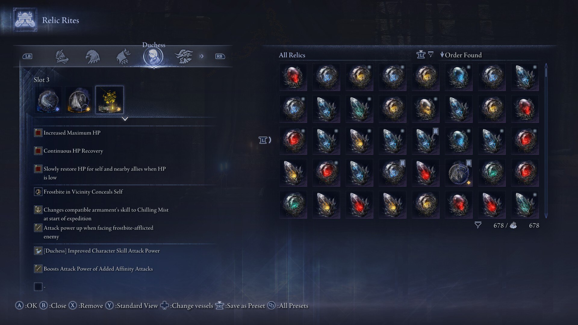 通常,我们更喜欢为我们的大多数夜行者版本堆叠一些专用的生存被动技能。然而,当面对格拉迪乌斯时,这并没有多大帮助。无论你叠加多少伤害无效被动技能,Gladius 仍然可以通过 AOE 攻击一击毙命大多数夜行者。因此,我们将主要关注伤害增益,更重要的是亲和力伤害增益。对于公爵夫人的建造,我们选择了雾气的遗物,适用霜。此外,我们还建议使用可以赋予你起始武器的遗物流血地位。