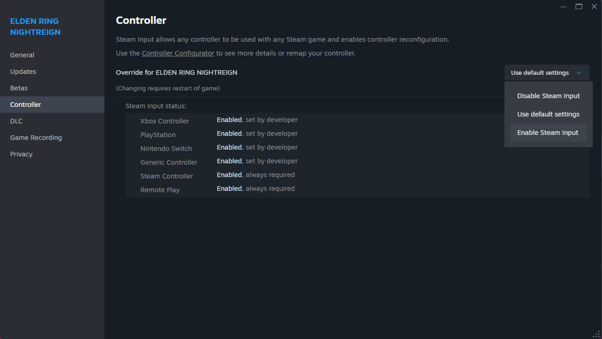 Steam 输入这一功能通常会导致某些控制器最初停止工作。因此,导致《Elden Ring Nightreign》控制器无法工作的最常见问题是蒸汽输入。解决此问题的方法是简单地启用 Steam 输入,以下是轻松实现此操作的方法: