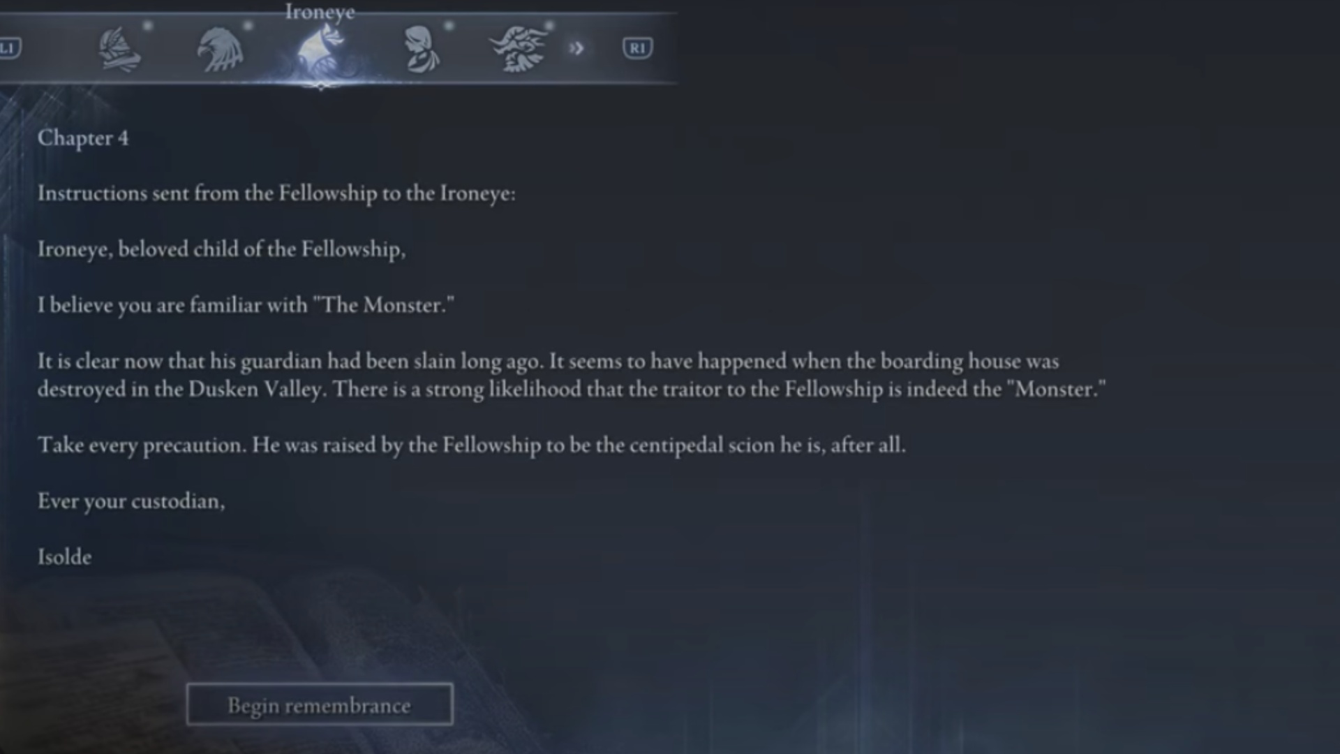 铁眼纪念任务可在日志的第 4 章中找到。读完本章后,您将在页面上看到“开始纪念”选项。选择它即可进入记忆的神秘境界。
