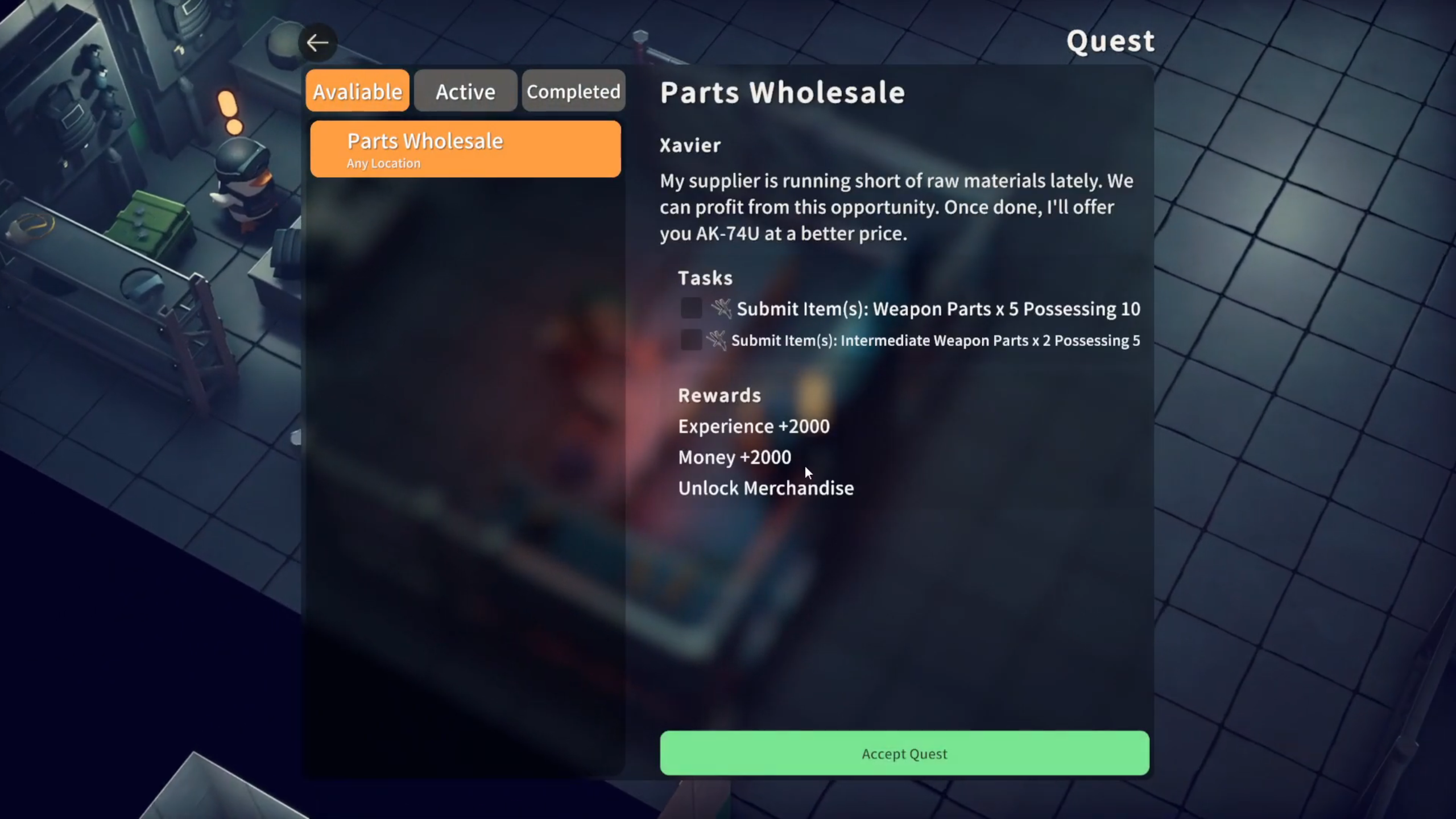 | 配件批发 | – | 交付:x5 武器零件 交付:x2 中级武器零件 | 1,000 经验值 1,000 货币 AK-74U(解锁) |