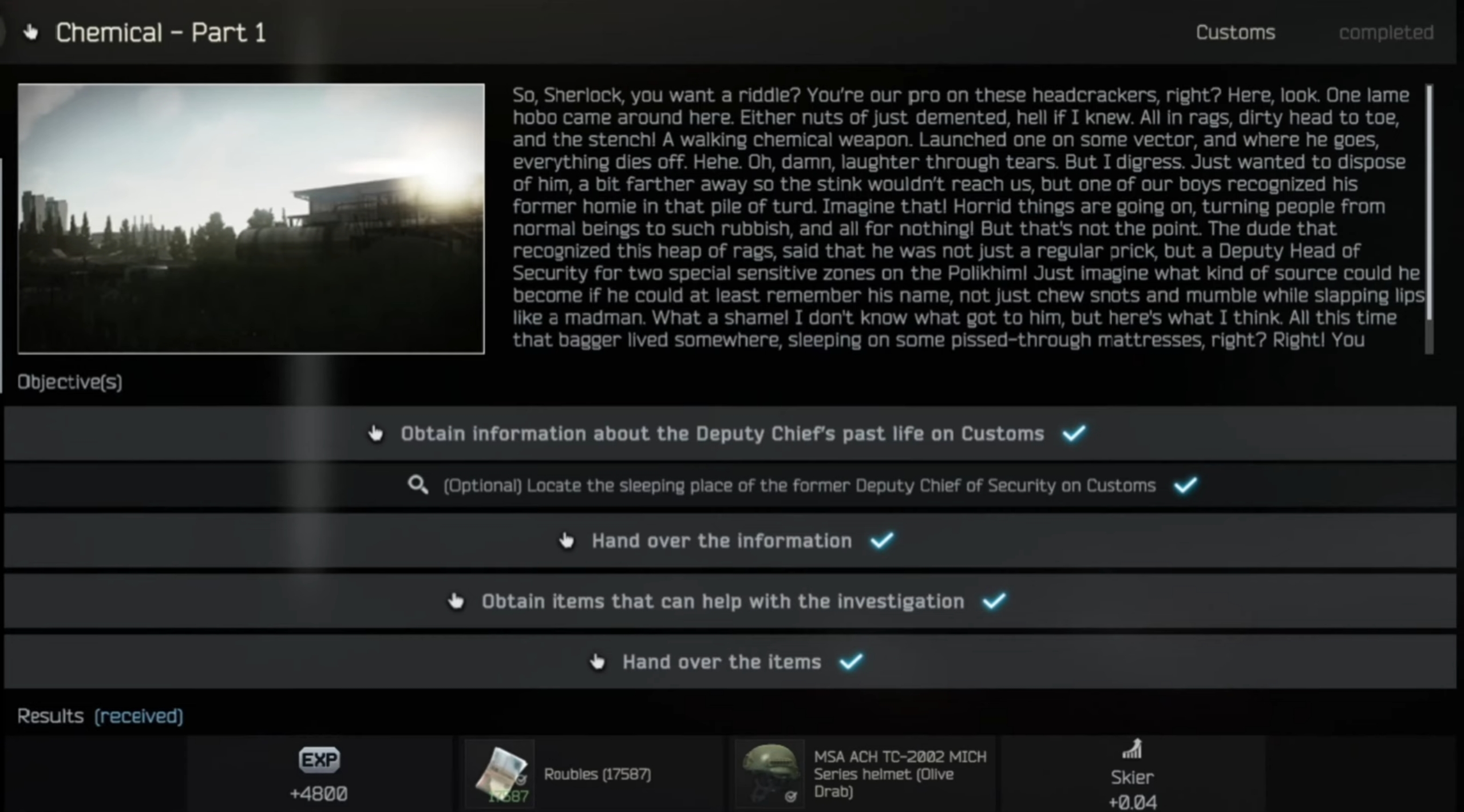 您可以开始化学品第 1 部分作为 Skier 提供的首批任务之一。该任务没有等级要求,但任务物品只有在激活时才会出现。通过与滑雪者交谈并在白天或夜间发起突袭来开始任务海关地图。