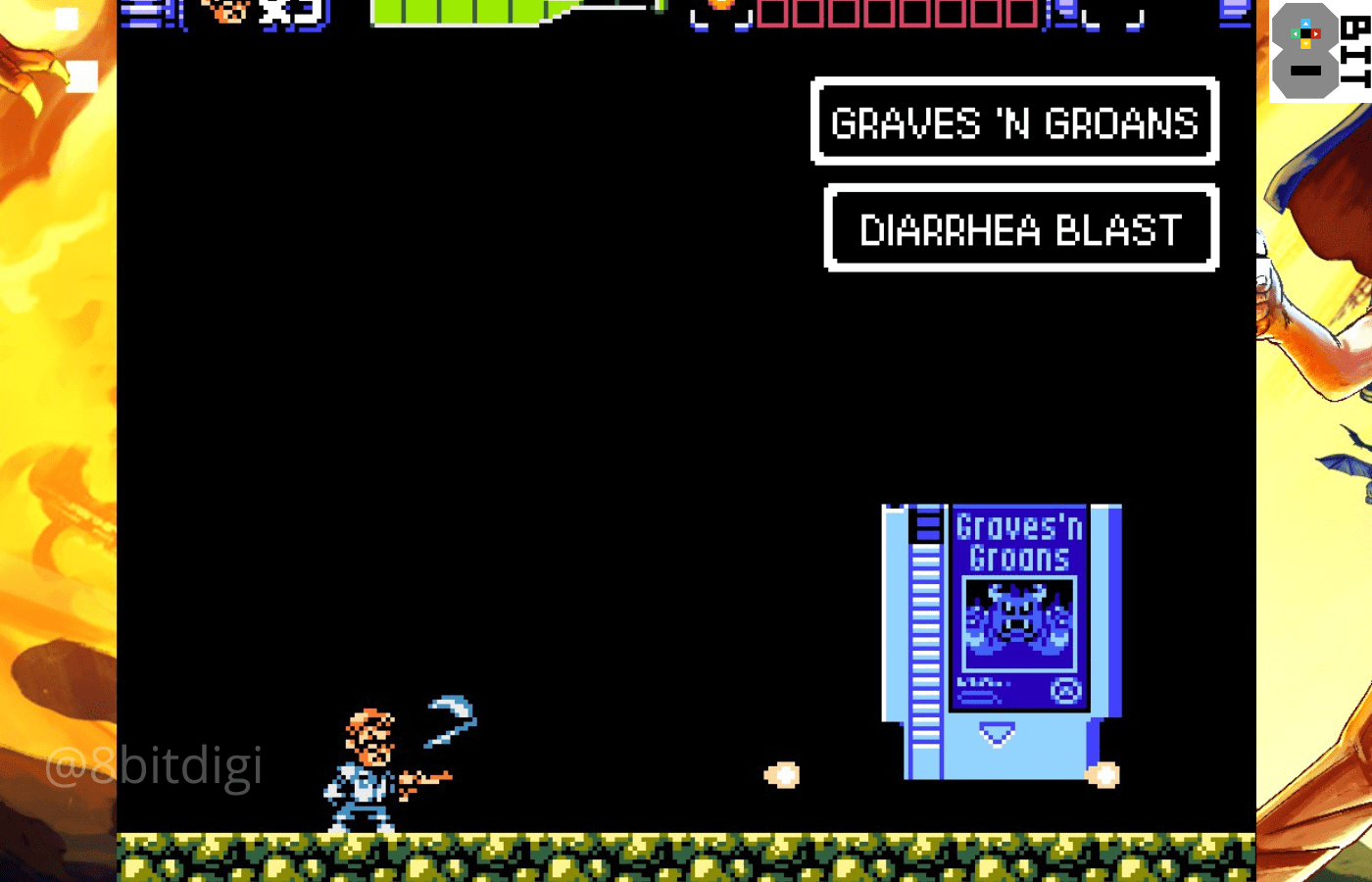 演示以 8 位版本的《愤怒的电子游戏书呆子》主题曲开始。玩家可以选择从 Graves 'n Groans 或 Soda Factory 关卡开始。自始至终,书呆子都用他标志性的愤怒表情怒目而视。