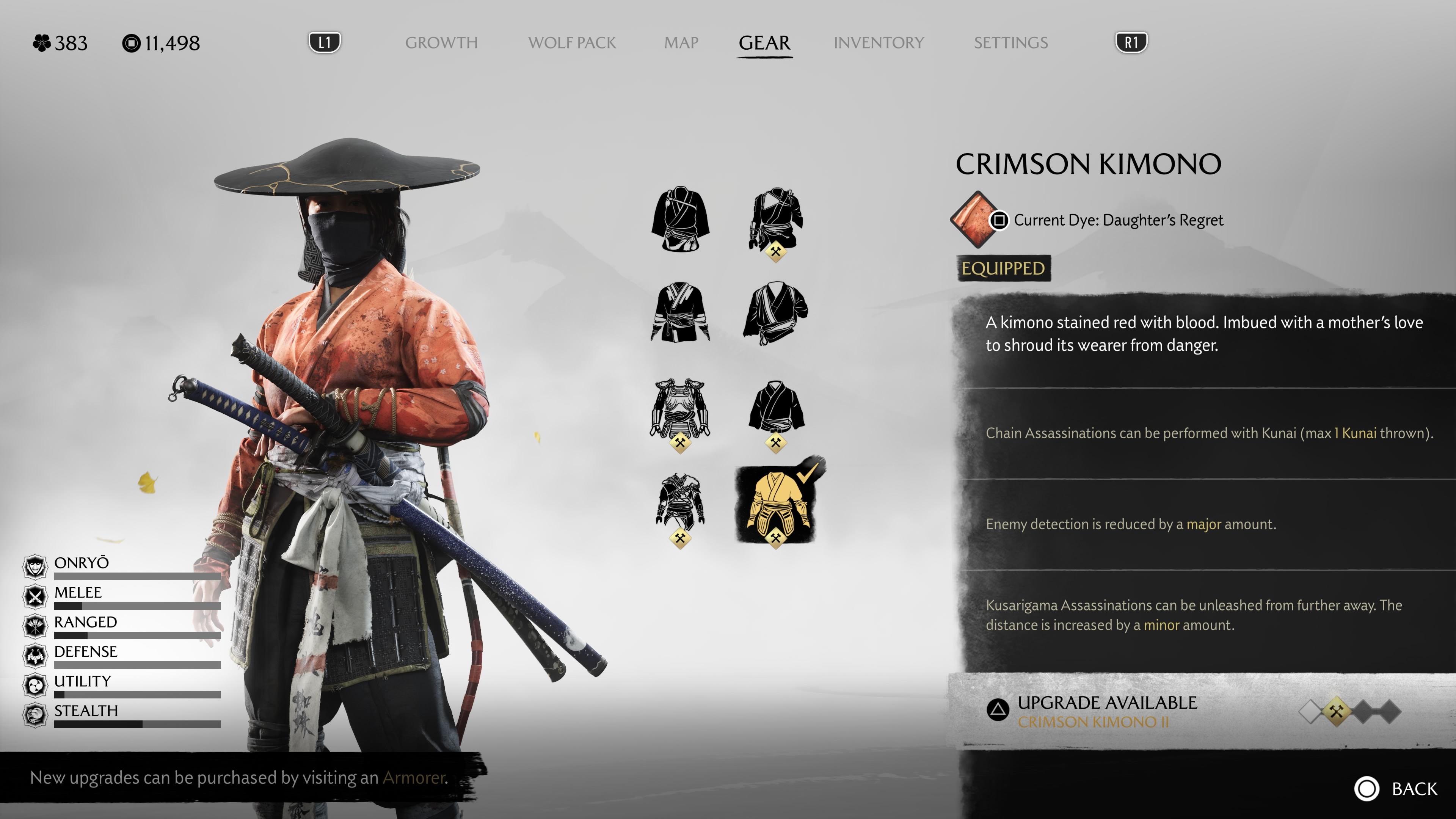 | 阴龙铠甲 | 这是 Atsu 从一开始就会穿着的默认盔甲。因此,您不必获取它。此外,随着你在战役中的进展,盔甲会自动升级。 | 完全升级后,铠甲具有以下效果: 用精神攻击或投掷近战武器杀死敌人有一定几率吓倒附近的敌人。 当敌人受到惊吓时,狼有很大的机会出现。 受到惊吓的敌人会受到大量增加的伤害。 |