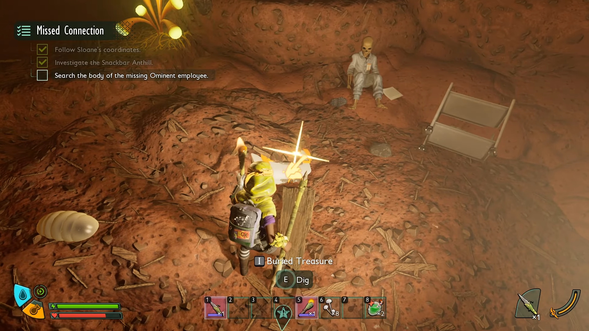继续往前走,你会发现尸体和埋藏的宝藏。与埋藏的宝藏互动以找到“Snackbar TURBO 光盘”和“Myrmecological 令牌。”翻遍 Omninent 员工的尸体以找到新的全能工具铲升级和“地下避难所”盒式磁带。