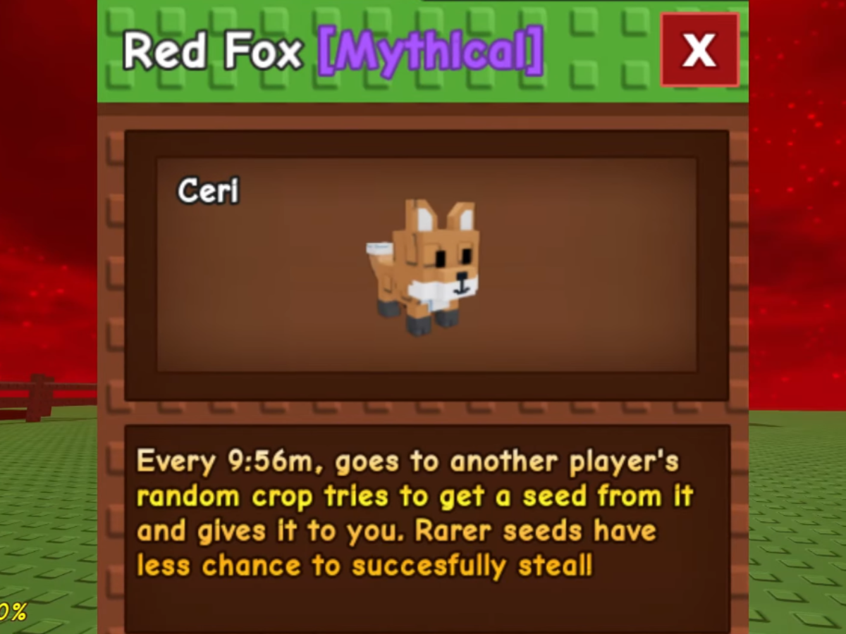 在血月活动期间,红狐被添加为“种植花园”中的神话级宠物。由于其特殊的被动能力,即大约每十分钟尝试从随机玩家的花园中窃取一颗种子(事件作物除外),因此它受到高度追捧。