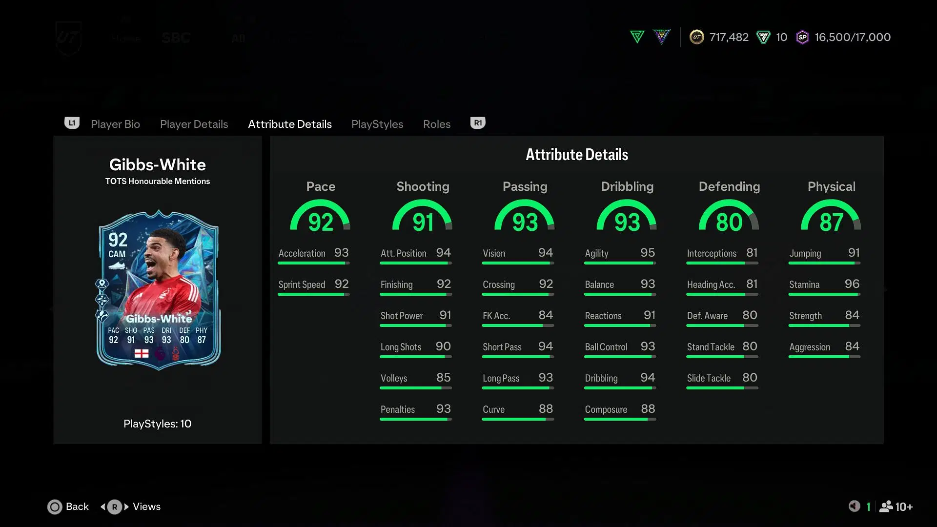 吉布斯-怀特拥有 93 的运球、94 的视野、92 的射门和 96 的耐力等数据,非常适合侵略性、快节奏的比赛风格。他在中场没有任何薄弱环节,而且由于他的传球范围和控球能力,他可以轻松地在多种阵型中兼任边锋或攻击型中锋。