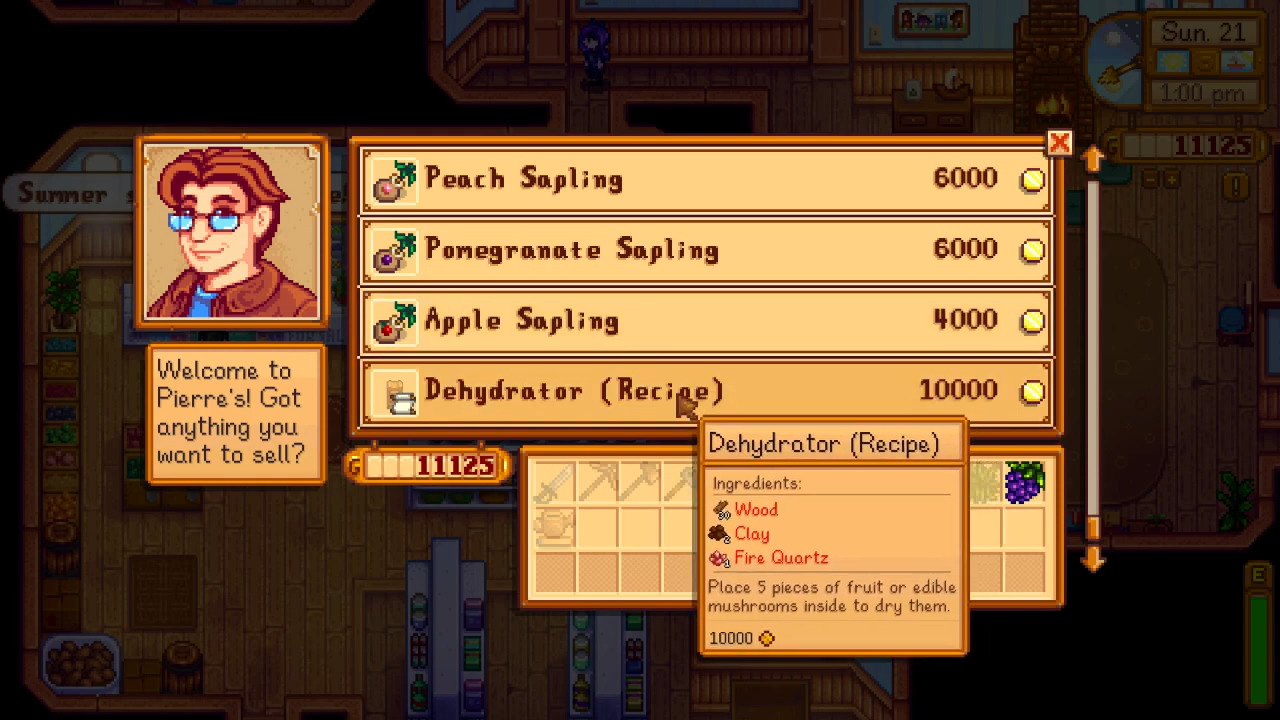 干蘑菇和干水果分别需要五个任意蘑菇和五个任意水果。此外,葡萄干需要五颗葡萄。干蘑菇和水果的售价比其基本版本高出 7.5 倍以上。葡萄干也卖600克。因此,这些干货以及脱水机是赚取额外收入的好方法。