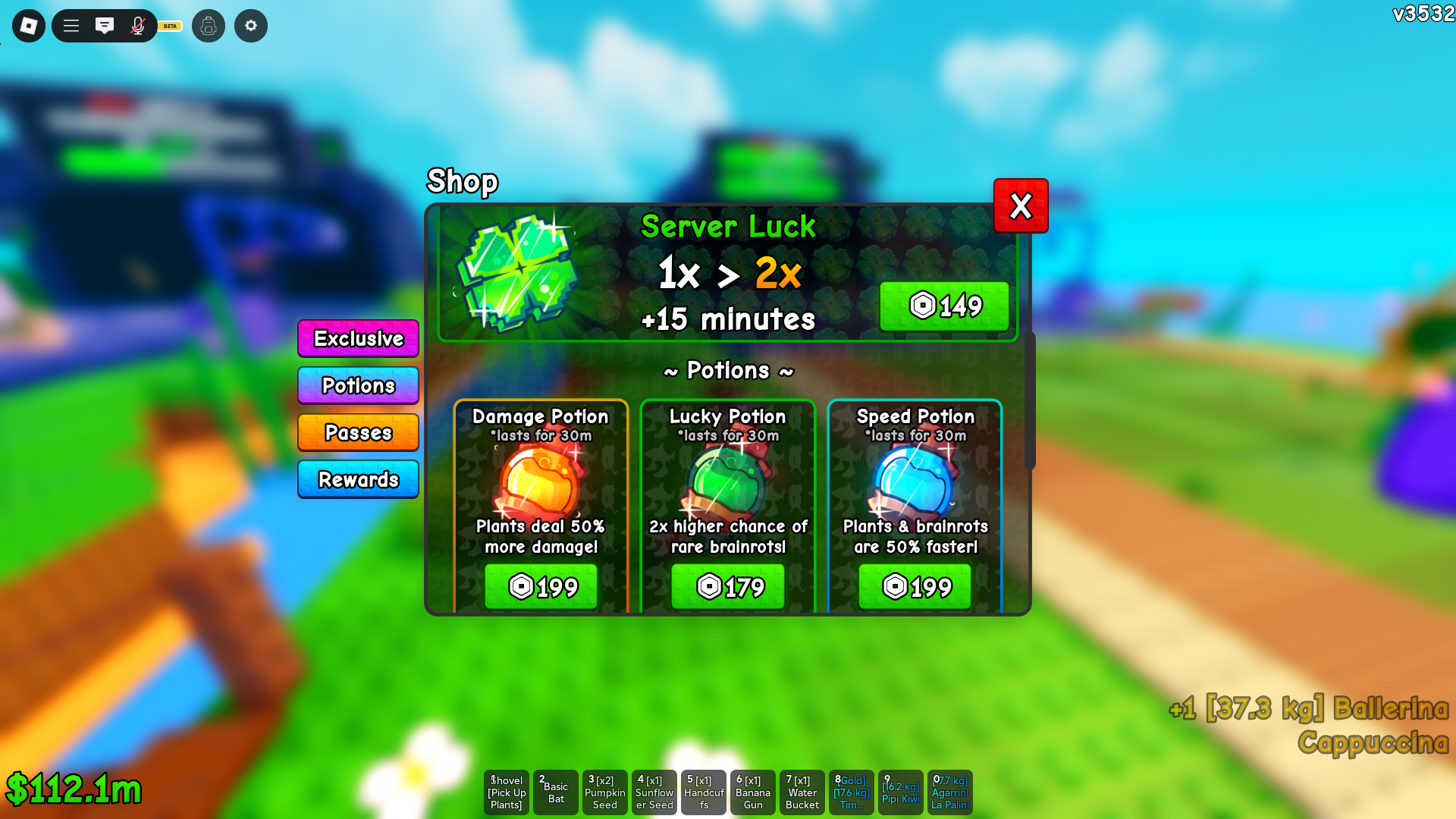 运气是 Roblox 上植物大战脑腐游戏体验的一个重要因素。它决定哪些 Brainrot 会出现在跑步机上。有几种方法可以将运气应用到你的情节中。您可以等待每 100 个 Brainrots 获得默认的 10 倍运气,或者获取一些运气提升药水。此外,您随时可以花费 Robux 为您的服务器购买 Boosted Luck。