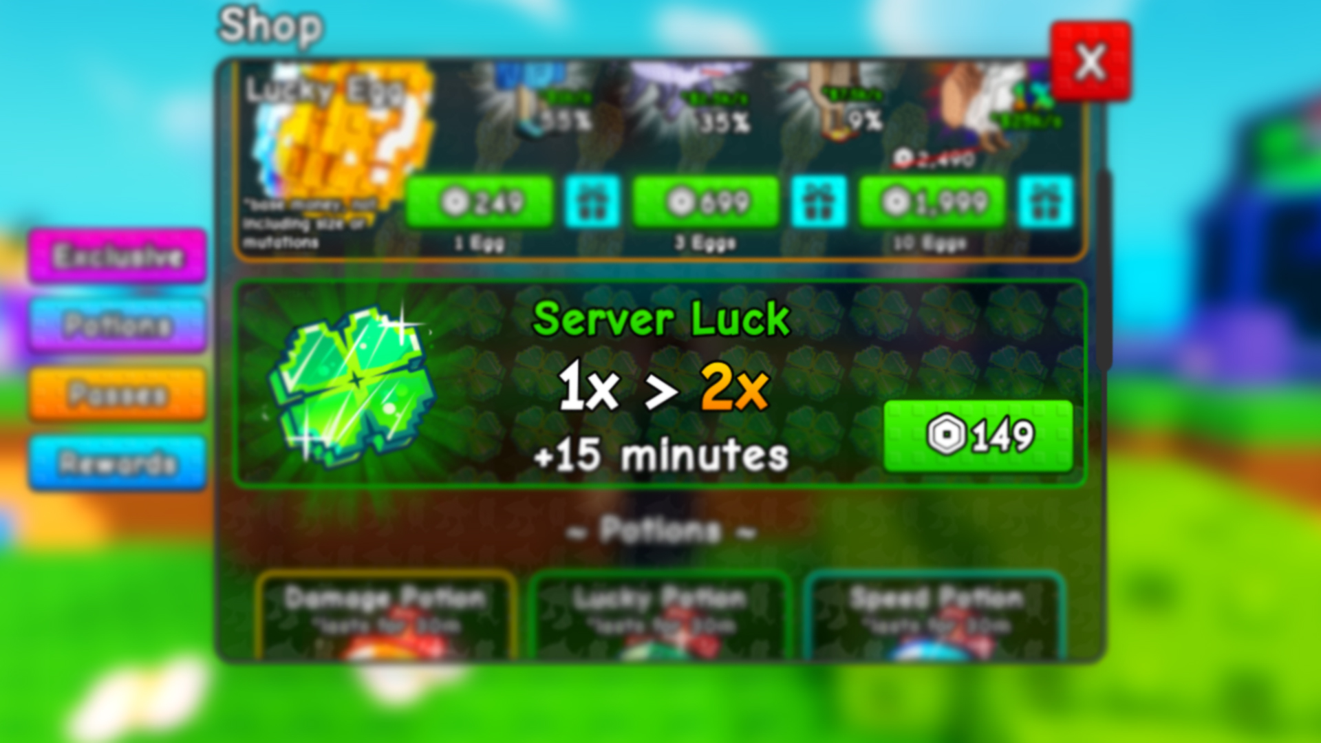 服务器运气游戏通行证是获得更多运气的另一种方式。 Gamepass 可以用 149 Robux 购买,并且适用于整个服务器。这将为您和您的 Robloxians 同伴带来 15 分钟的运气提升。虽然它比幸运药水便宜,但你只能使用 15 分钟。您可以免费启动私人服务器并购买此游戏通行证。您还可以邀请您的朋友加入服务器以获得额外奖励。