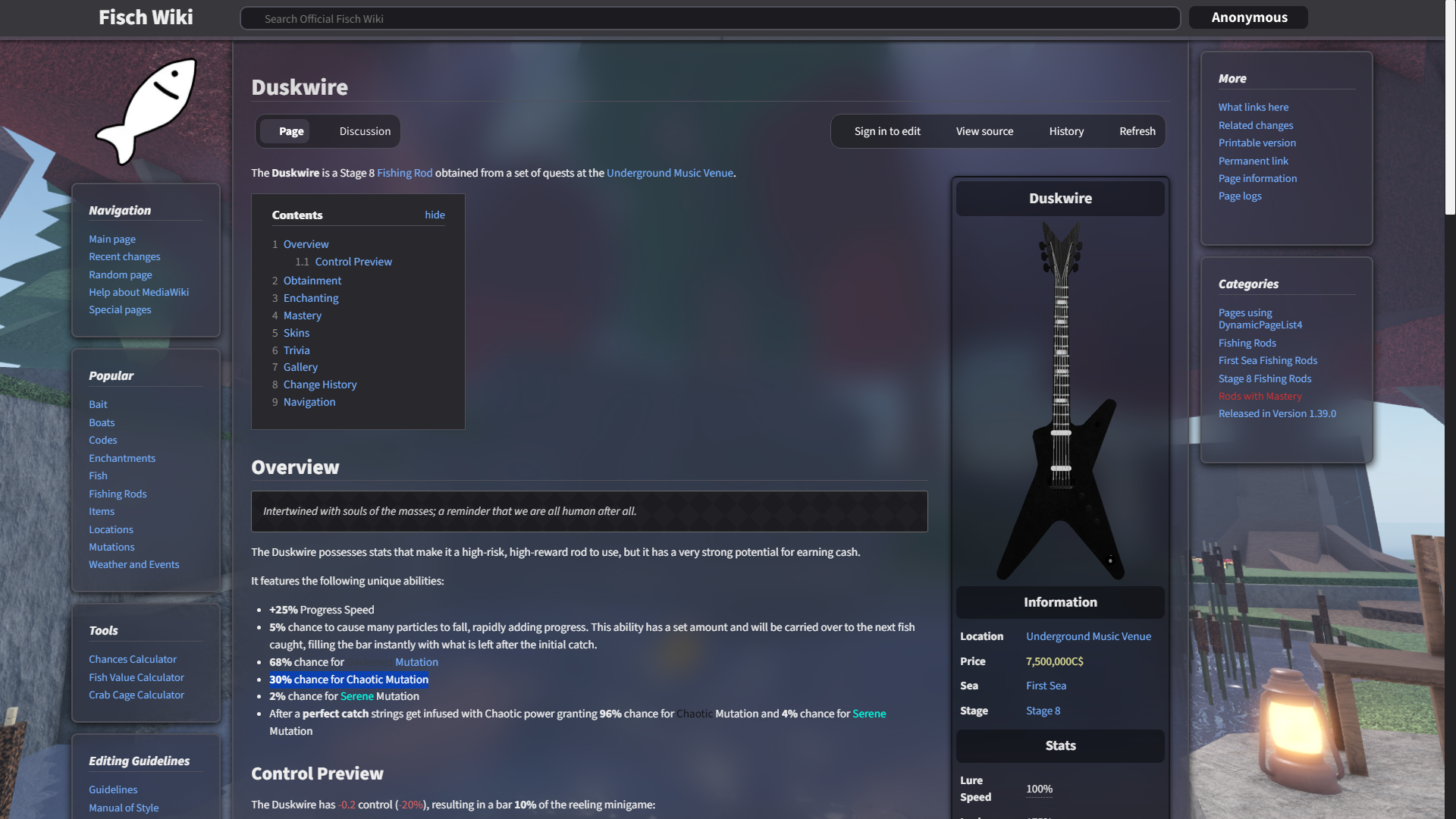 混沌附魔遗物是带有混沌变异的稀有遗物,可以让玩家解锁地下音乐场。它不能像其他变异(例如海克斯或神性)那样通过评估圣物来获得,因此必须在钓鱼时捕获或通过交易获得。