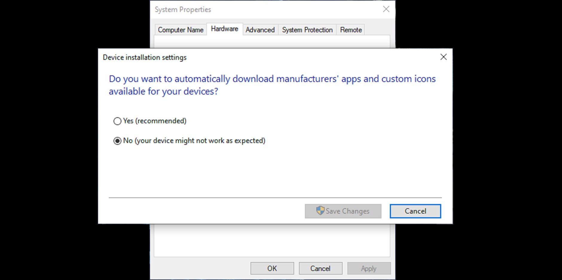 - 接下来,选择硬件选项卡并单击设备安装设置。