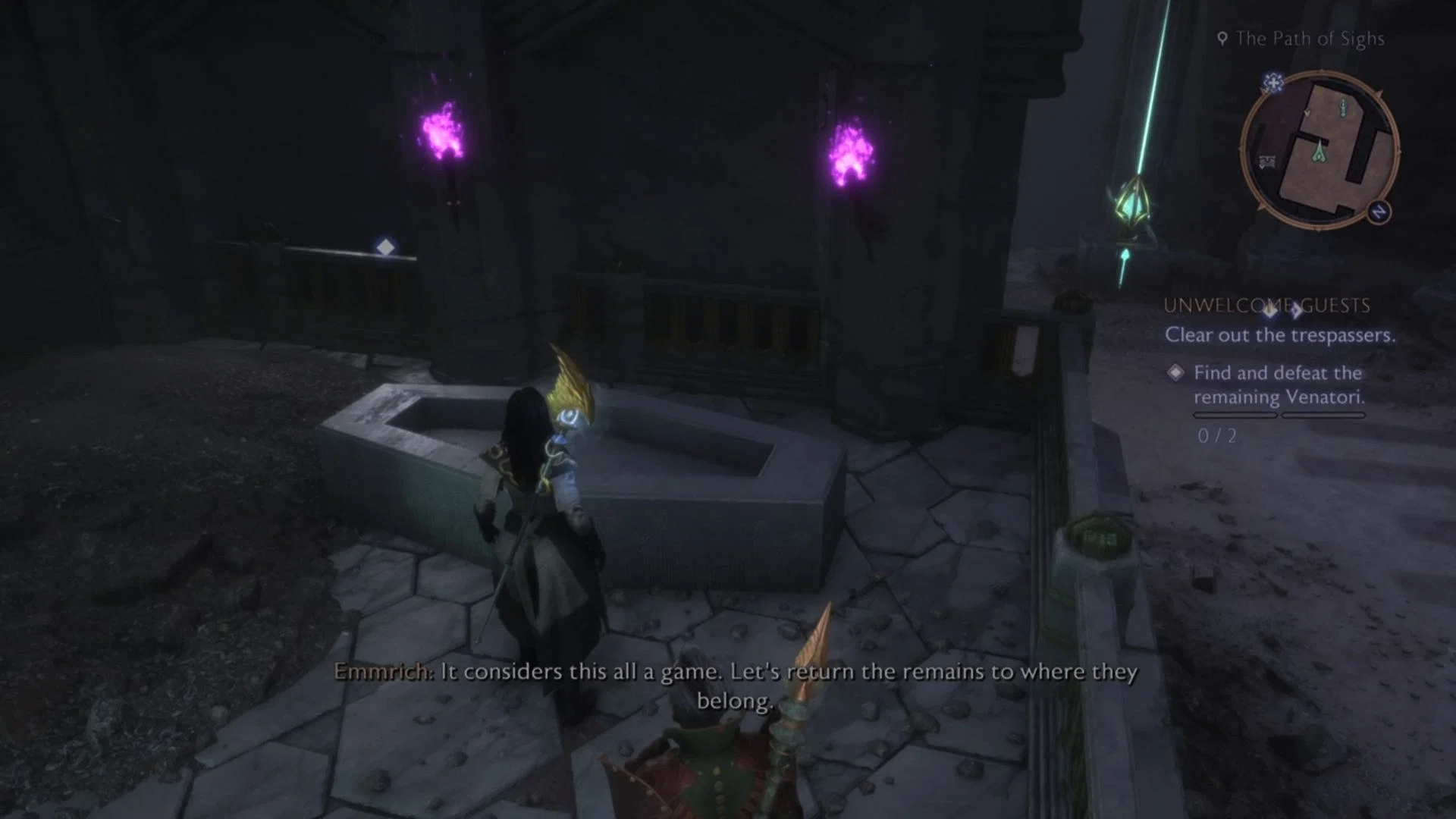 紫色火炬拼图位于大墓地。你会在附近遇到这个谜题叹息之路区域;然而,有一个问题。要访问此谜题,您需要有埃姆里奇作为你的伴侣。一旦你在你的队伍中招募了艾姆里奇,你将解锁前往大墓地的快速旅行。从大墓地的艾露维安十字路口一直走,直到到达该地区的商人。在中央枢纽区域的商人附近,走左门并继续前进,直到到达尽头有一座雕像的大楼梯。走下楼梯,前往雕像旁边的房间。在房间里,你会发现一口棺材,由两支紫色火把守卫着。