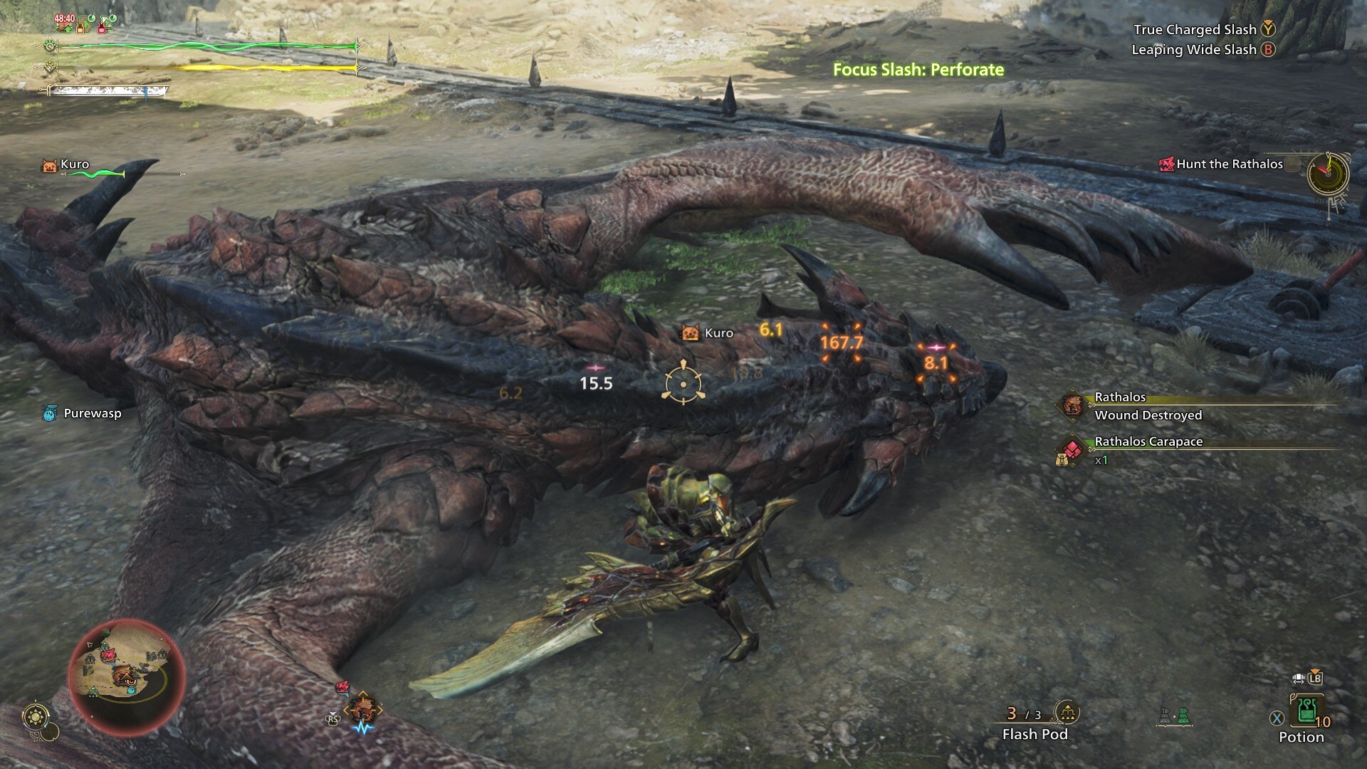 - 优先打破火龙的头,后退,最重要的是,翅膀, 尽快地。请注意,翅膀的碰撞箱从怪物的爪尖开始。你可以敲击翅膀的顶端来打破它。
