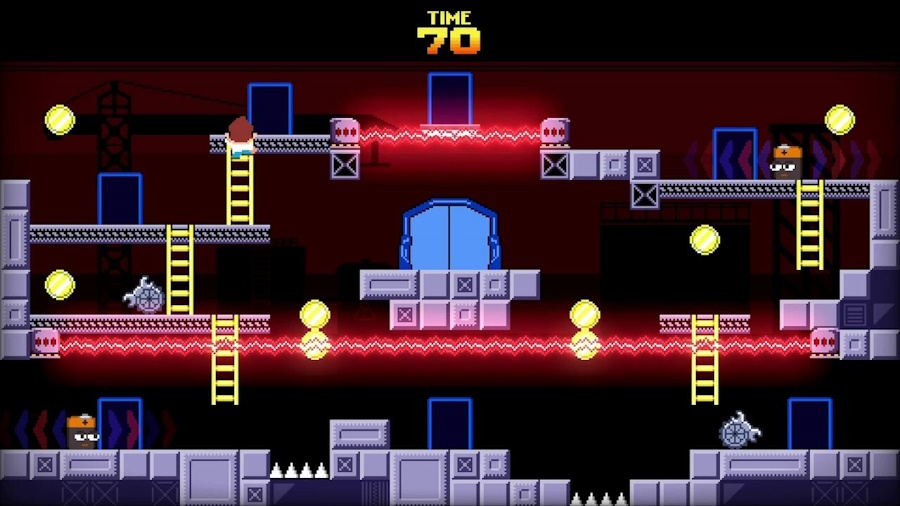 您将从仓库出发,前往工厂,然后前往停车场,然后才能到达最后一个地点。默认难度设置为“普通”,这提供了很好的挑战,但又不会让人感到不知所措。如果游戏结束,您可以花费 30 个沿途收集的金币继续游戏。当您使用 B 按钮跳跃时,您将使用左侧模拟摇杆或 D-Pad 控制您的角色。您可以根据需要按Y按钮打开和关闭门,并可以按X按钮进入门。关上门会发出冲击波,改变敌人的颜色,这是你靠近他们的提示,这样你就可以踢他们!