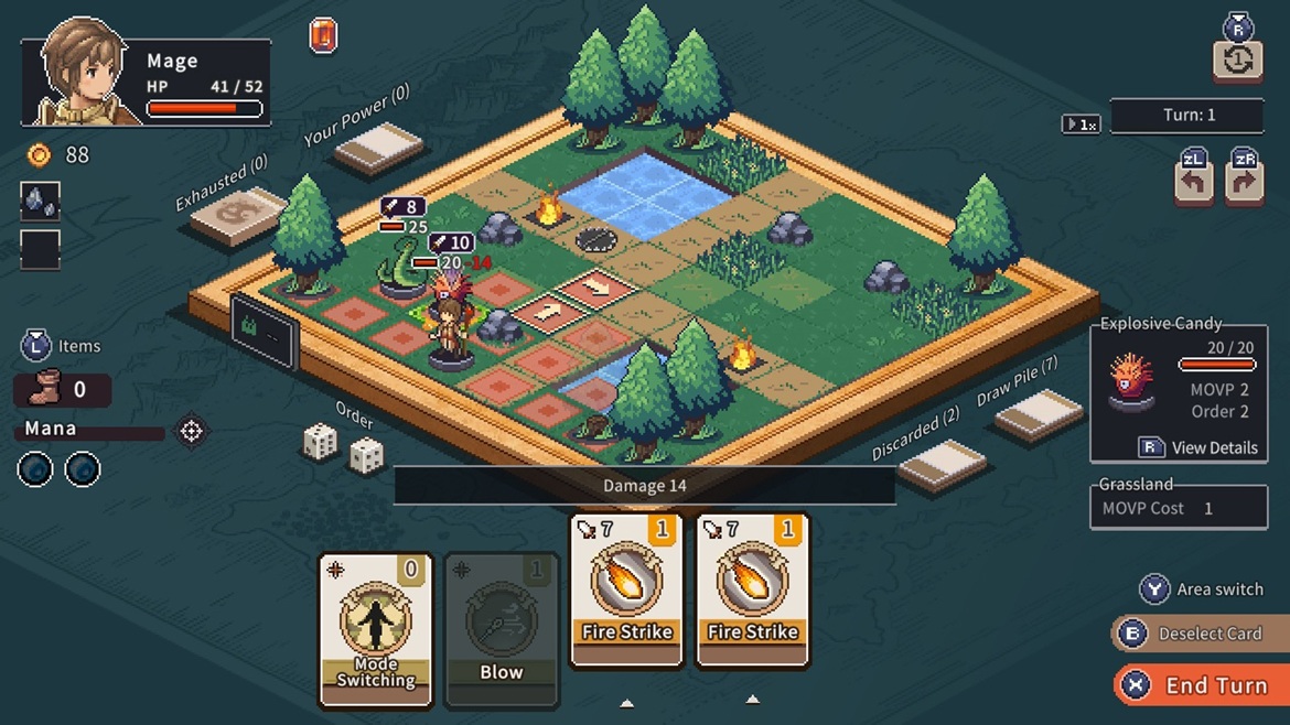 抵达幻想乐园后不久,您将被送入第一场战斗。该游戏可以通过使用 Nintendo Switch Joy-Con 来玩,或者在便携式或桌面模式下玩时充分利用控制台的触摸屏,或者如果您在 Nintendo Switch Lite 控制台上玩游戏。如果您使用 Nintendo Switch Joy-Con,那么您将使用左侧模拟摇杆在网格上移动光标。您还可以使用方向键在网格上一次移动一格。屏幕右侧将显示网格的相关信息。将光标指向敌人可查看其详细统计数据,例如生命值 (HP)、移动点和顺序。您还可以查看网格上每个方块的统计数据,以便您可以知道在该空间上移动需要多少个移动点。草地需要1个移动点。当光标位于敌人上方时,您可以按R按钮来查看其不同的攻击和能力,以及当它决定防御时会获得多少护甲点。