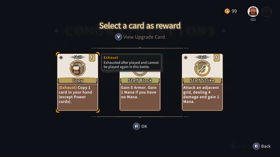 要打牌,您需要花费一些行动点(AP)。您可以在每张卡的右上角查看 AP。卡牌还将显示其名称、卡牌类型、使用时适用的伤害/护甲点以及一般描述。假设您正在尝试打“Strike”牌。这是一张攻击卡,消耗 1 AP,造成 6 点伤害。最后一点显示在屏幕的左上角以及卡的描述中。另一方面,基本防御是一张防御卡,可以让你获得 5 点护甲点来防御传入的攻击。您可以使用光标从屏幕底部选择一张卡牌,或者按Y按钮在战场和卡牌区之间切换。您可以同时打出多张进攻或防守牌以加快速度。