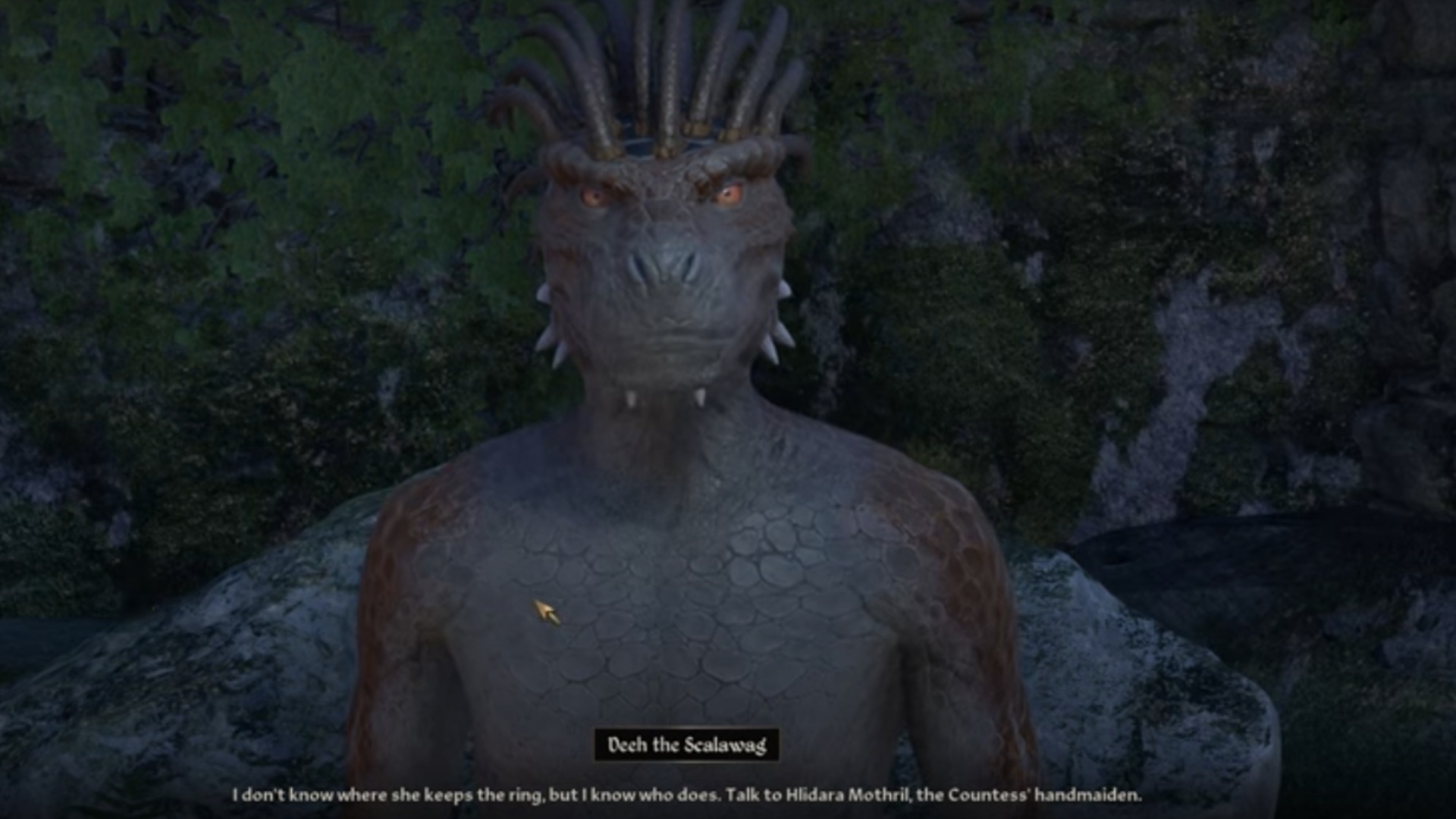 你需要回到乞丐那里,询问伯爵夫人和戒指的情况。接下来,他会带你去见伯爵夫人的侍女希尔达拉·莫斯里尔。到达城堡的宴会厅并找到希尔达拉。在询问戒指的情况后,她告诉您戒指位于阿莱西亚床边的珠宝盒中。此外,她还告知了从城堡地下室到王座室的一条隐藏道路。