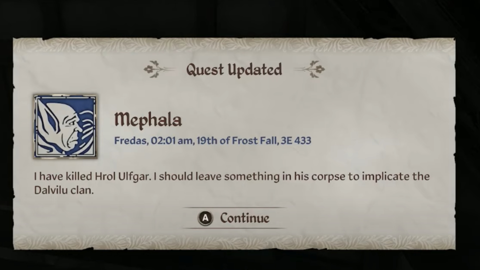 为了完成这个目标,请等到午夜并进入达尔维卢的家。杀死尼凡·达尔维鲁并将乌尔夫加家族戒指植入尸体上。然后,前往赫罗尔·乌尔夫加的家。他很可能在一楼睡觉。消灭他并将匕首放在他的身上。