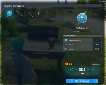 打东西。这正是我来的目的。有人已经搭建了一个工作台,所以我建造了其中一个,然后发现我需要制作一个 Pokeba...Pal Sphere 来捕捉一只我窒息的鸡...将其击倒。